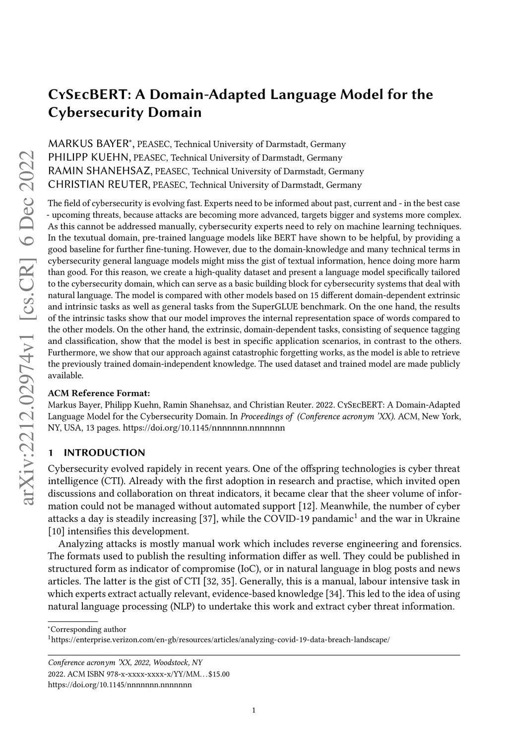 The field of cybersecurity is evolving fast. Experts need to be informed about past, current and - in the best case - upcoming threats, because attacks are becoming more advanced, targets bigger and systems more complex. As this cannot be addressed manually, cybersecurity experts need to rely on machine learning techniques. In the texutual domain, pre-trained language models like BERT have shown to be helpful, by providing a good baseline for further fine-tuning. However, due to the domain-knowledge and many technical terms in cybersecurity general language models might miss the gist of textual information, hence doing more harm than good. For this reason, we create a high-quality dataset and present a language model specifically tailored to the cybersecurity domain, which can serve as a basic building block for cybersecurity systems that deal with natural language. The model is compared with other models based on 15 different domain-dependent extrinsic and intrinsic tasks as well as general tasks from the SuperGLUE benchmark. On the one hand, the results of the intrinsic tasks show that our model improves the internal representation space of words compared to the other models. On the other hand, the extrinsic, domain-dependent tasks, consisting of sequence tagging and classification, show that the model is best in specific application scenarios, in contrast to the others. Furthermore, we show that our approach against catastrophic forgetting works, as the model is able to retrieve the previously trained domain-independent knowledge. The used dataset and trained model are made publicly available