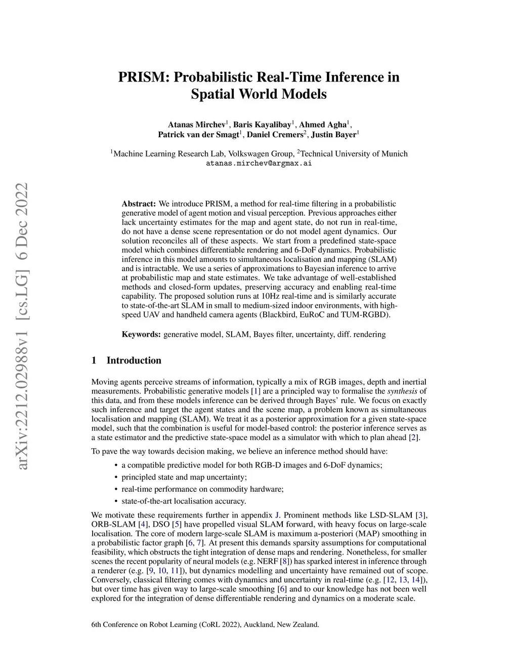 We introduce PRISM, a method for real-time filtering in a probabilistic generative model of agent motion and visual perception. Previous approaches either lack uncertainty estimates for the map and agent state, do not run in real-time, do not have a dense scene representation or do not model agent dynamics. Our solution reconciles all of these aspects. We start from a predefined state-space model which combines differentiable rendering and 6-DoF dynamics. Probabilistic inference in this model amounts to simultaneous localisation and mapping (SLAM) and is intractable. We use a series of approximations to Bayesian inference to arrive at probabilistic map and state estimates. We take advantage of well-established methods and closed-form updates, preserving accuracy and enabling real-time capability. The proposed solution runs at 10Hz real-time and is similarly accurate to state-of-the-art SLAM in small to medium-sized indoor environments, with high-speed UAV and handheld camera agents (Blackbird, EuRoC and TUM-RGBD).
