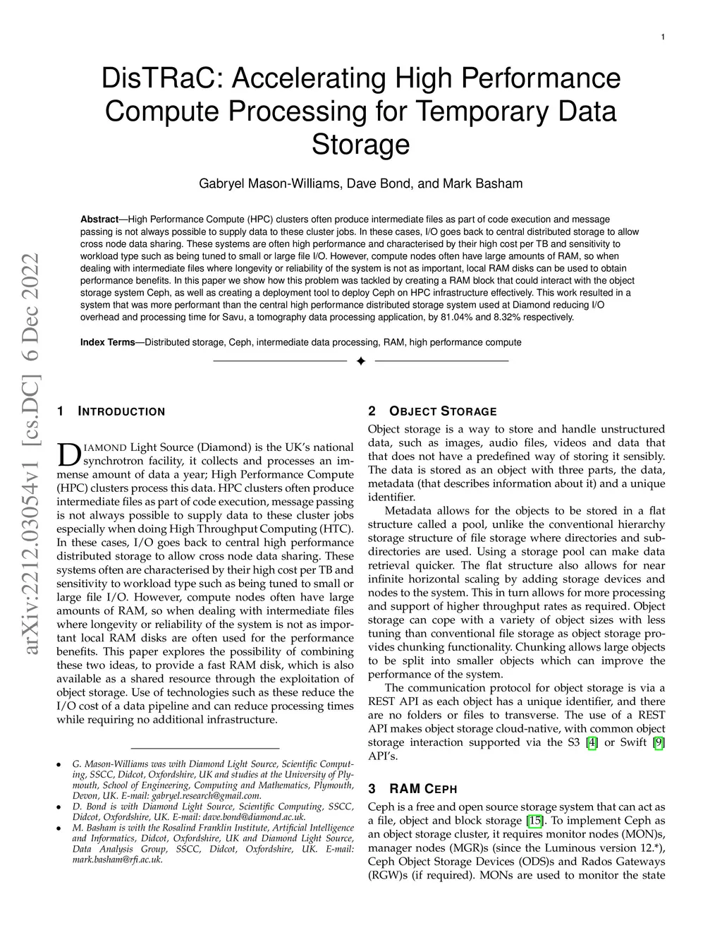 High Performance Compute (HPC) clusters often produce intermediate files as part of code execution and message passing is not always possible to supply data to these cluster jobs. In these cases, I/O goes back to central distributed storage to allow cross node data sharing. These systems are often high performance and characterised by their high cost per TB and sensitivity to workload type such as being tuned to small or large file I/O. However, compute nodes often have large amounts of RAM, so when dealing with intermediate files where longevity or reliability of the system is not as important, local RAM disks can be used to obtain performance benefits. In this paper we show how this problem was tackled by creating a RAM block that could interact with the object storage system Ceph, as well as creating a deployment tool to deploy Ceph on HPC infrastructure effectively. This work resulted in a system that was more performant than the central high performance distributed storage system used at Diamond reducing I/O overhead and processing time for Savu, a tomography data processing application, by 81.04% and 8.32% respectively.