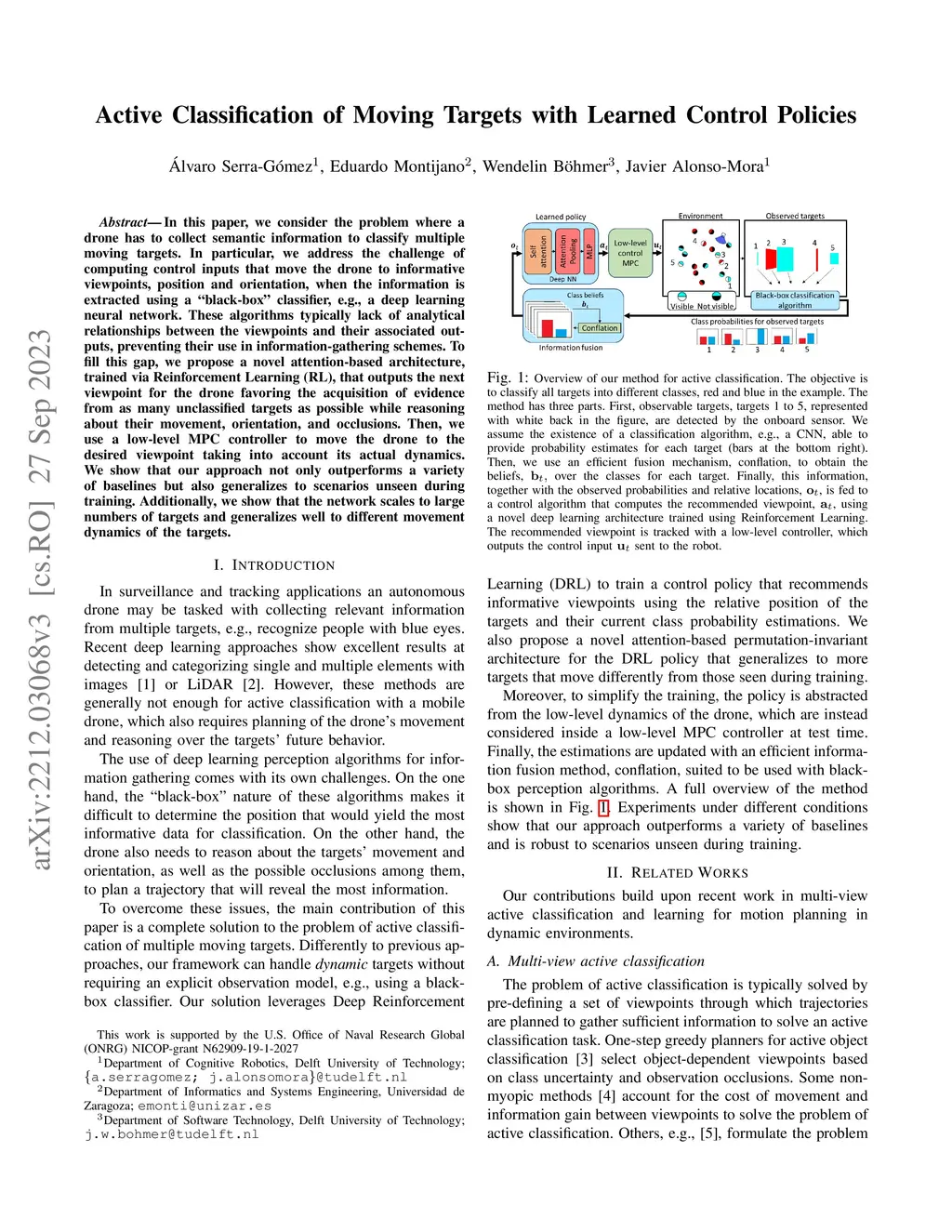 In this paper, we consider the problem where a drone has to collect semantic information to classify multiple moving targets. In particular, we address the challenge of computing control inputs that move the drone to informative viewpoints, position and orientation, when the information is extracted using a "black-box" classifier, e.g., a deep learning neural network. These algorithms typically lack of analytical relationships between the viewpoints and their associated outputs, preventing their use in information-gathering schemes. To fill this gap, we propose a novel attention-based architecture, trained via Reinforcement Learning (RL), that outputs the next viewpoint for the drone favoring the acquisition of evidence from as many unclassified targets as possible while reasoning about their movement, orientation, and occlusions. Then, we use a low-level MPC controller to move the drone to the desired viewpoint taking into account its actual dynamics. We show that our approach not only outperforms a variety of baselines but also generalizes to scenarios unseen during training. Additionally, we show that the network scales to large numbers of targets and generalizes well to different movement dynamics of the targets.