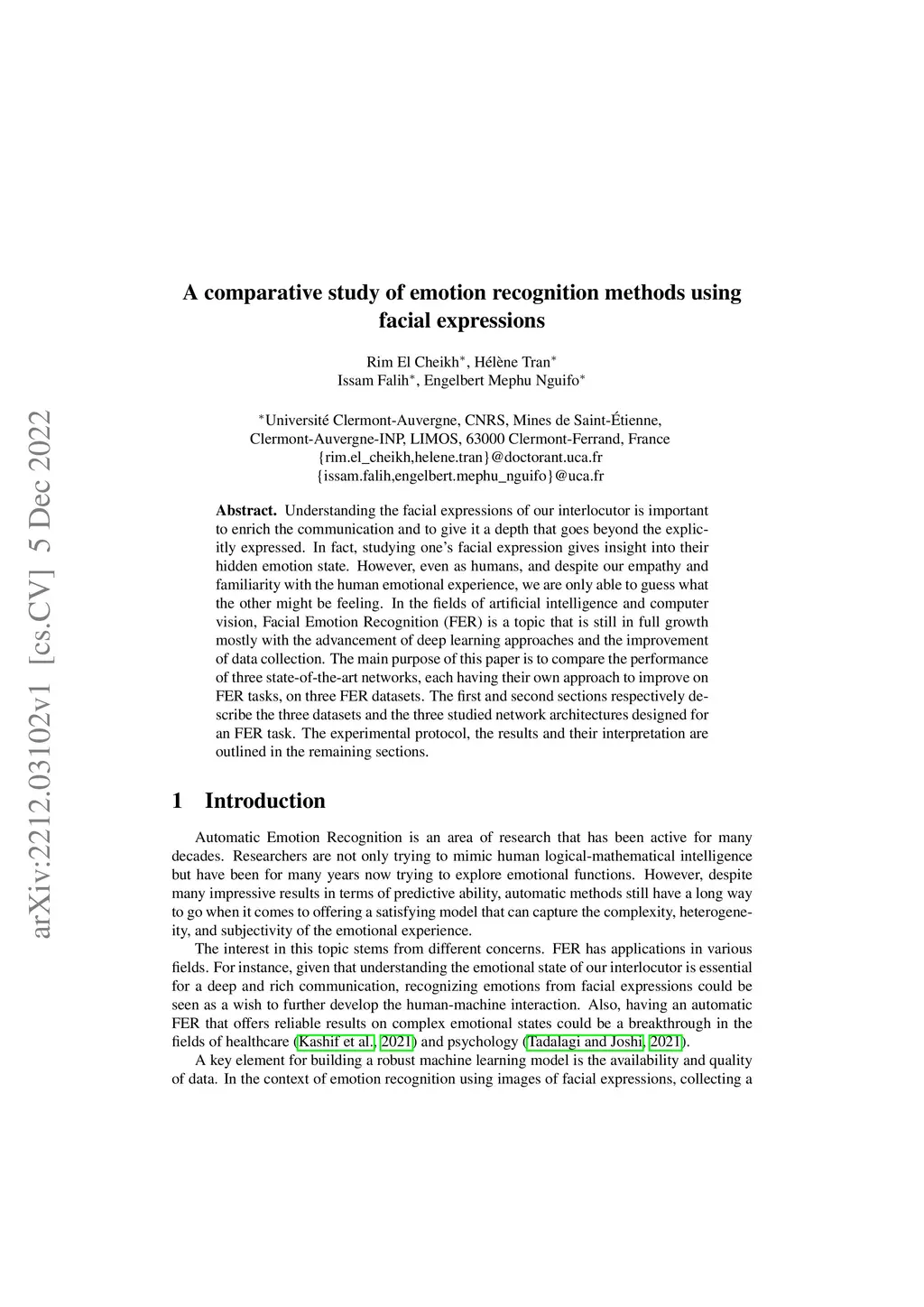 Understanding the facial expressions of our interlocutor is important to enrich the communication and to give it a depth that goes beyond the explicitly expressed. In fact, studying one's facial expression gives insight into their hidden emotion state. However, even as humans, and despite our empathy and familiarity with the human emotional experience, we are only able to guess what the other might be feeling. In the fields of artificial intelligence and computer vision, Facial Emotion Recognition (FER) is a topic that is still in full growth mostly with the advancement of deep learning approaches and the improvement of data collection. The main purpose of this paper is to compare the performance of three state-of-the-art networks, each having their own approach to improve on FER tasks, on three FER datasets. The first and second sections respectively describe the three datasets and the three studied network architectures designed for an FER task. The experimental protocol, the results and their interpretation are outlined in the remaining sections.