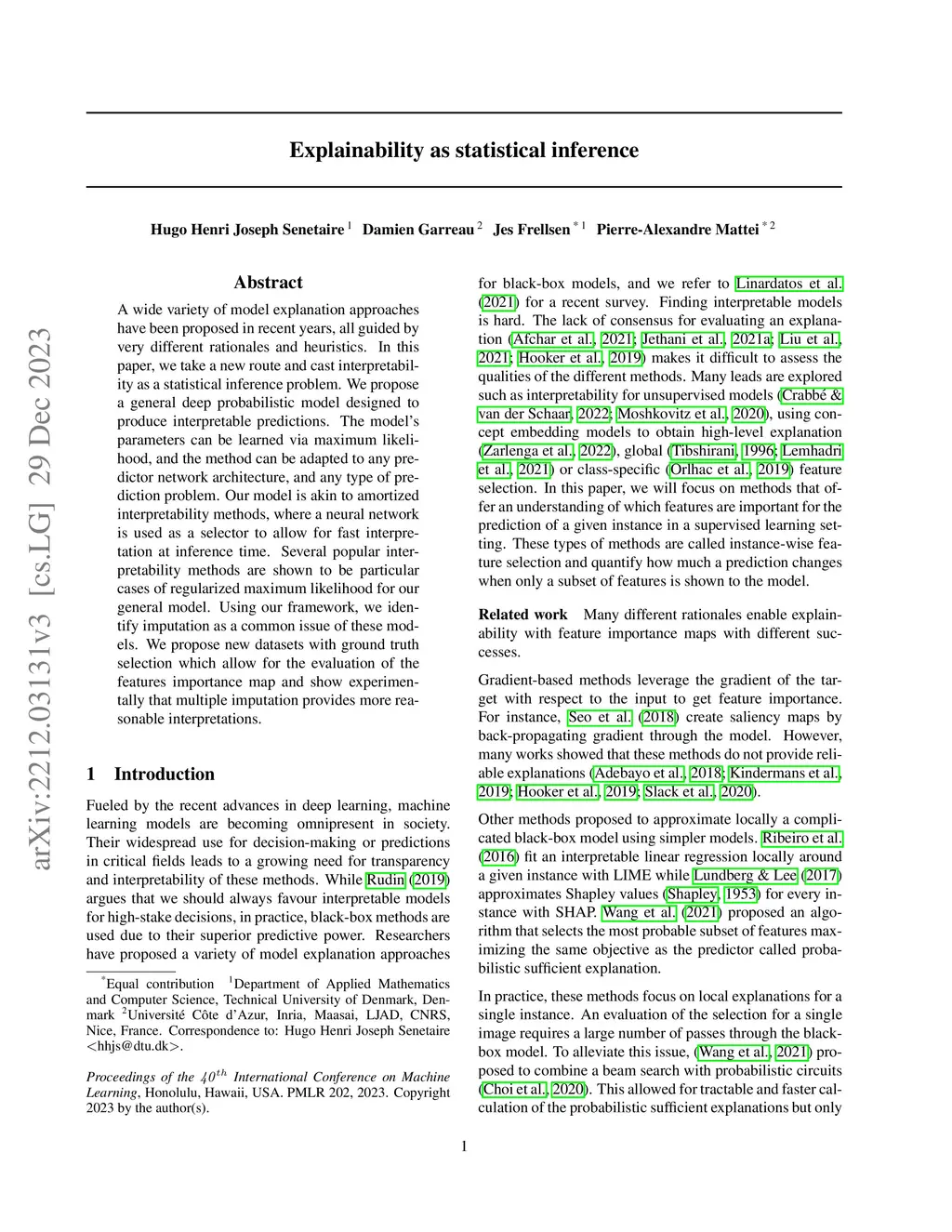 A wide variety of model explanation approaches have been proposed in recent years, all guided by very different rationales and heuristics. In this paper, we take a new route and cast interpretability as a statistical inference problem. We propose a general deep probabilistic model designed to produce interpretable predictions. The model parameters can be learned via maximum likelihood, and the method can be adapted to any predictor network architecture and any type of prediction problem. Our method is a case of amortized interpretability models, where a neural network is used as a selector to allow for fast interpretation at inference time. Several popular interpretability methods are shown to be particular cases of regularised maximum likelihood for our general model. We propose new datasets with ground truth selection which allow for the evaluation of the features importance map. Using these datasets, we show experimentally that using multiple imputation provides more reasonable interpretations.