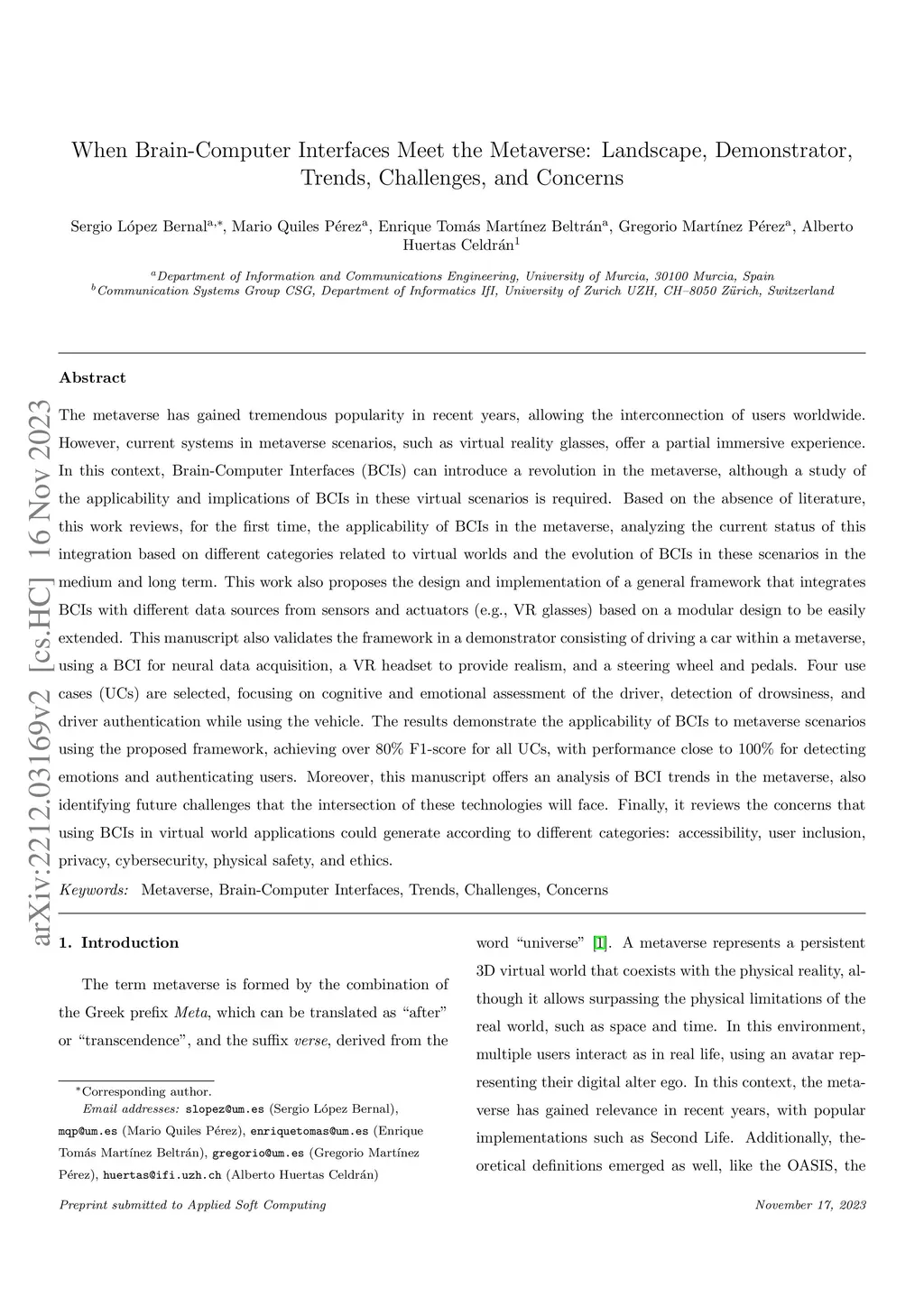 The metaverse has gained tremendous popularity in recent years, allowing the interconnection of users worldwide. However, current systems in metaverse scenarios, such as virtual reality glasses, offer a partial immersive experience. In this context, Brain-Computer Interfaces (BCIs) can introduce a revolution in the metaverse, although a study of the applicability and implications of BCIs in these virtual scenarios is required. Based on the absence of literature, this work reviews, for the first time, the applicability of BCIs in the metaverse, analyzing the current status of this integration based on different categories related to virtual worlds and the evolution of BCIs in these scenarios in the medium and long term. This work also proposes the design and implementation of a general framework that integrates BCIs with different data sources from sensors and actuators (e.g., VR glasses) based on a modular design to be easily extended. This manuscript also validates the framework in a demonstrator consisting of driving a car within a metaverse, using a BCI for neural data acquisition, a VR headset to provide realism, and a steering wheel and pedals. Four use cases (UCs) are selected, focusing on cognitive and emotional assessment of the driver, detection of drowsiness, and driver authentication while using the vehicle. Moreover, this manuscript offers an analysis of BCI trends in the metaverse, also identifying future challenges that the intersection of these technologies will face. Finally, it reviews the concerns that using BCIs in virtual world applications could generate according to different categories: accessibility, user inclusion, privacy, cybersecurity, physical safety, and ethics.
