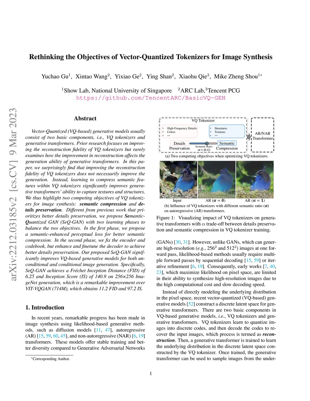 Vector-Quantized (VQ-based) generative models usually consist of two basic components, i.e., VQ tokenizers and generative transformers. Prior research focuses on improving the reconstruction fidelity of VQ tokenizers but rarely examines how the improvement in reconstruction affects the generation ability of generative transformers. In this paper, we surprisingly find that improving the reconstruction fidelity of VQ tokenizers does not necessarily improve the generation. Instead, learning to compress semantic features within VQ tokenizers significantly improves generative transformers' ability to capture textures and structures. We thus highlight two competing objectives of VQ tokenizers for image synthesis: semantic compression and details preservation. Different from previous work that only pursues better details preservation, we propose Semantic-Quantized GAN (SeQ-GAN) with two learning phases to balance the two objectives. In the first phase, we propose a semantic-enhanced perceptual loss for better semantic compression. In the second phase, we fix the encoder and codebook, but enhance and finetune the decoder to achieve better details preservation. The proposed SeQ-GAN greatly improves VQ-based generative models and surpasses the GAN and Diffusion Models on both unconditional and conditional image generation. Our SeQ-GAN (364M) achieves Frechet Inception Distance (FID) of 6.25 and Inception Score (IS) of 140.9 on 256x256 ImageNet generation, a remarkable improvement over VIT-VQGAN (714M), which obtains 11.2 FID and 97.2 IS.