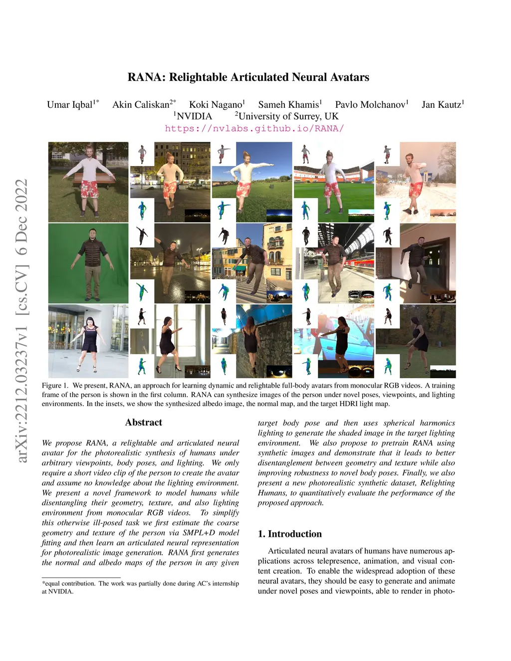 We propose RANA, a relightable and articulated neural avatar for the photorealistic synthesis of humans under arbitrary viewpoints, body poses, and lighting. We only require a short video clip of the person to create the avatar and assume no knowledge about the lighting environment. We present a novel framework to model humans while disentangling their geometry, texture, and also lighting environment from monocular RGB videos. To simplify this otherwise ill-posed task we first estimate the coarse geometry and texture of the person via SMPL+D model fitting and then learn an articulated neural representation for photorealistic image generation. RANA first generates the normal and albedo maps of the person in any given target body pose and then uses spherical harmonics lighting to generate the shaded image in the target lighting environment. We also propose to pretrain RANA using synthetic images and demonstrate that it leads to better disentanglement between geometry and texture while also improving robustness to novel body poses. Finally, we also present a new photorealistic synthetic dataset, Relighting Humans, to quantitatively evaluate the performance of the proposed approach.
