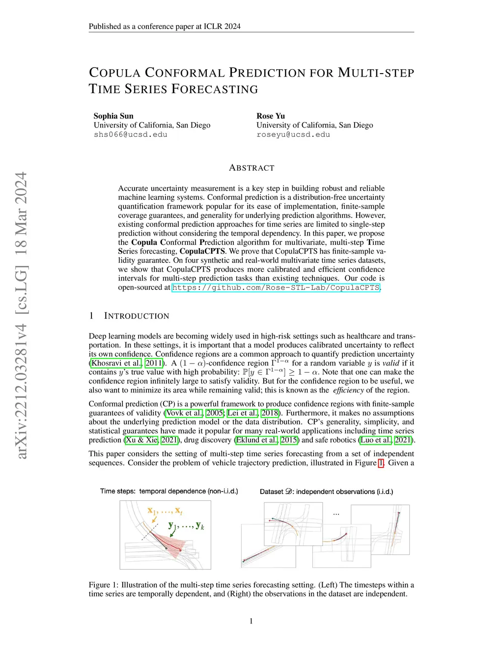 Accurate uncertainty measurement is a key step to building robust and reliable machine learning systems. Conformal prediction is a distribution-free uncertainty quantification algorithm popular for its ease of implementation, statistical coverage guarantees, and versatility for underlying forecasters. However, existing conformal prediction algorithms for time series are limited to single-step prediction without considering the temporal dependency. In this paper, we propose a Copula Conformal Prediction algorithm for multivariate, multi-step Time Series forecasting, CopulaCPTS. We prove that CopulaCPTS has finite sample validity guarantee. On several synthetic and real-world multivariate time series datasets, we show that CopulaCPTS produces more calibrated and sharp confidence intervals for multi-step prediction tasks than existing techniques.