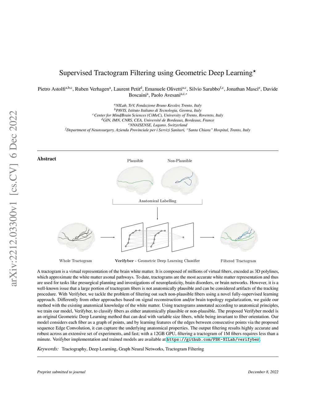 A tractogram is a virtual representation of the brain white matter. It is composed of millions of virtual fibers, encoded as 3D polylines, which approximate the white matter axonal pathways. To date, tractograms are the most accurate white matter representation and thus are used for tasks like presurgical planning and investigations of neuroplasticity, brain disorders, or brain networks. However, it is a well-known issue that a large portion of tractogram fibers is not anatomically plausible and can be considered artifacts of the tracking procedure. With Verifyber, we tackle the problem of filtering out such non-plausible fibers using a novel fully-supervised learning approach. Differently from other approaches based on signal reconstruction and/or brain topology regularization, we guide our method with the existing anatomical knowledge of the white matter. Using tractograms annotated according to anatomical principles, we train our model, Verifyber, to classify fibers as either anatomically plausible or non-plausible. The proposed Verifyber model is an original Geometric Deep Learning method that can deal with variable size fibers, while being invariant to fiber orientation. Our model considers each fiber as a graph of points, and by learning features of the edges between consecutive points via the proposed sequence Edge Convolution, it can capture the underlying anatomical properties. The output filtering results highly accurate and robust across an extensive set of experiments, and fast; with a 12GB GPU, filtering a tractogram of 1M fibers requires less than a minute. Verifyber implementation and trained models are available at https://github.com/FBK-NILab/verifyber.