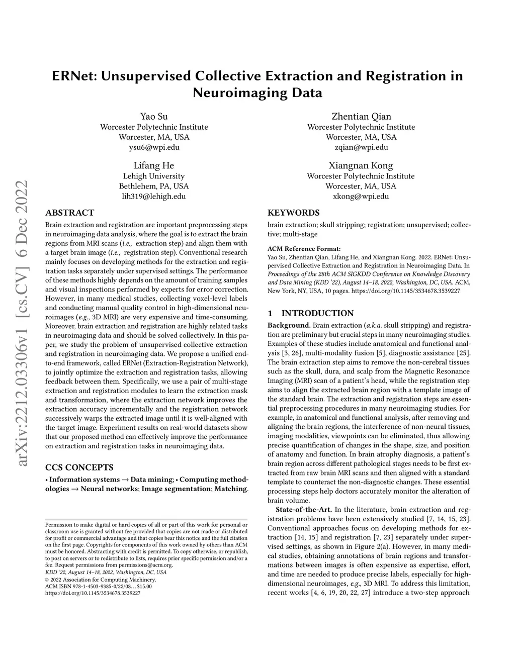 Brain extraction and registration are important preprocessing steps in neuroimaging data analysis, where the goal is to extract the brain regions from MRI scans (i.e., extraction step) and align them with a target brain image (i.e., registration step). Conventional research mainly focuses on developing methods for the extraction and registration tasks separately under supervised settings. The performance of these methods highly depends on the amount of training samples and visual inspections performed by experts for error correction. However, in many medical studies, collecting voxel-level labels and conducting manual quality control in high-dimensional neuroimages (e.g., 3D MRI) are very expensive and time-consuming. Moreover, brain extraction and registration are highly related tasks in neuroimaging data and should be solved collectively. In this paper, we study the problem of unsupervised collective extraction and registration in neuroimaging data. We propose a unified end-to-end framework, called ERNet (Extraction-Registration Network), to jointly optimize the extraction and registration tasks, allowing feedback between them. Specifically, we use a pair of multi-stage extraction and registration modules to learn the extraction mask and transformation, where the extraction network improves the extraction accuracy incrementally and the registration network successively warps the extracted image until it is well-aligned with the target image. Experiment results on real-world datasets show that our proposed method can effectively improve the performance on extraction and registration tasks in neuroimaging data. Our code and data can be found at https://github.com/ERNetERNet/ERNet