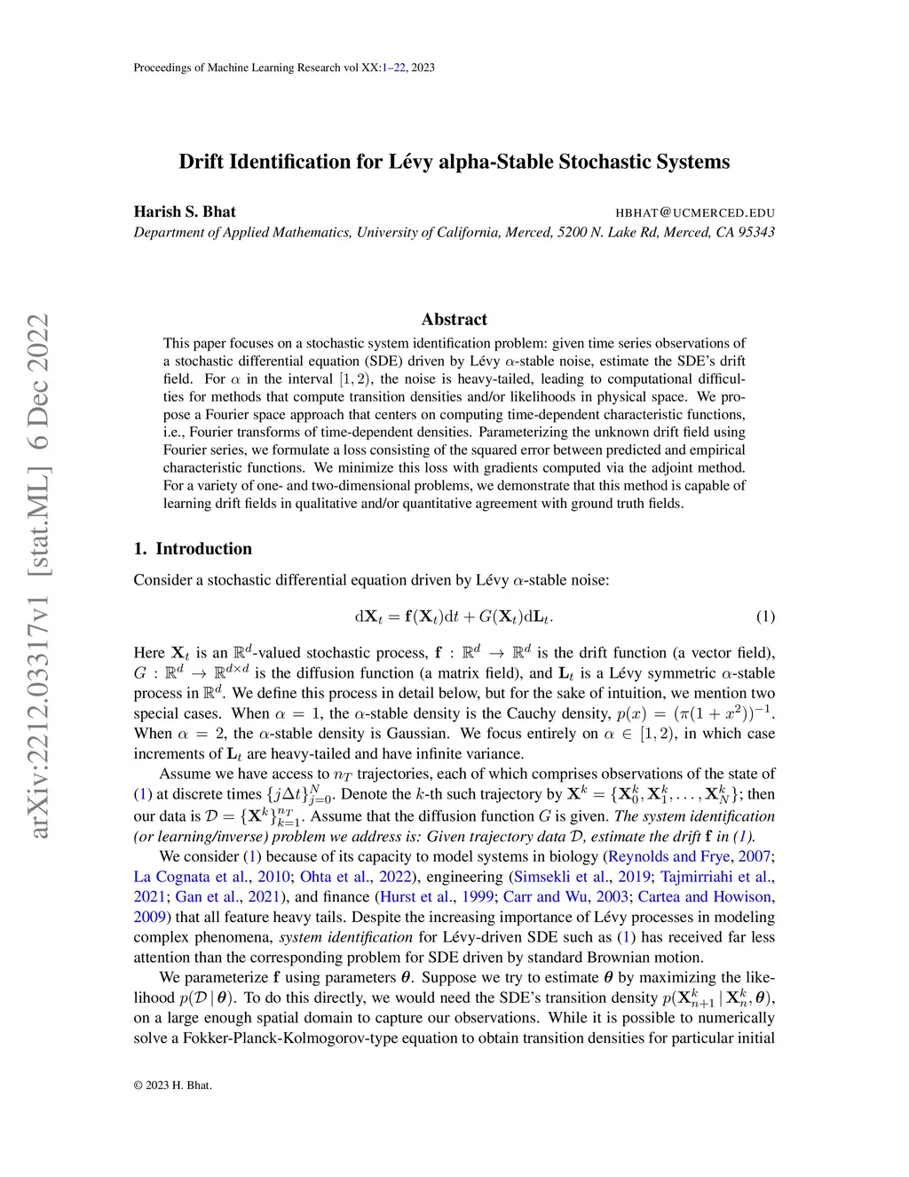 This paper focuses on a stochastic system identification problem: given time series observations of a stochastic differential equation (SDE) driven by L\'{e}vy -stable noise, estimate the SDE's drift field. For in the interval , the noise is heavy-tailed, leading to computational difficulties for methods that compute transition densities and/or likelihoods in physical space. We propose a Fourier space approach that centers on computing time-dependent characteristic functions, i.e., Fourier transforms of time-dependent densities. Parameterizing the unknown drift field using Fourier series, we formulate a loss consisting of the squared error between predicted and empirical characteristic functions. We minimize this loss with gradients computed via the adjoint method. For a variety of one- and two-dimensional problems, we demonstrate that this method is capable of learning drift fields in qualitative and/or quantitative agreement with ground truth fields.