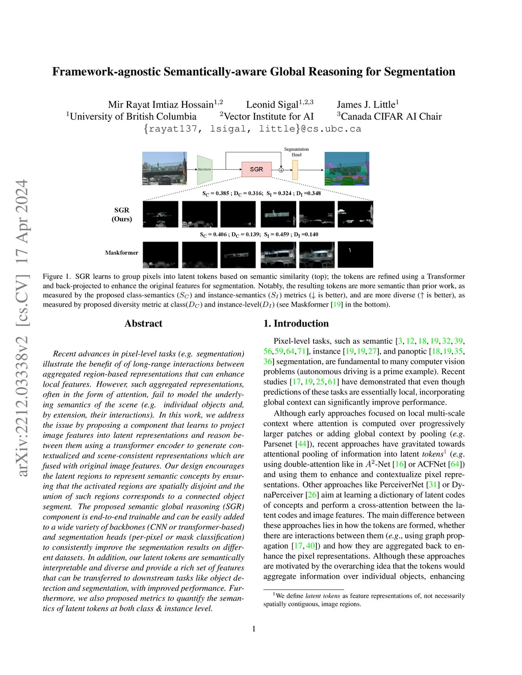 Recent advances in pixel-level tasks (e.g. segmentation) illustrate the benefit of of long-range interactions between aggregated region-based representations that can enhance local features. However, such aggregated representations, often in the form of attention, fail to model the underlying semantics of the scene (e.g. individual objects and, by extension, their interactions). In this work, we address the issue by proposing a component that learns to project image features into latent representations and reason between them using a transformer encoder to generate contextualized and scene-consistent representations which are fused with original image features. Our design encourages the latent regions to represent semantic concepts by ensuring that the activated regions are spatially disjoint and the union of such regions corresponds to a connected object segment. The proposed semantic global reasoning (SGR) component is end-to-end trainable and can be easily added to a wide variety of backbones (CNN or transformer-based) and segmentation heads (per-pixel or mask classification) to consistently improve the segmentation results on different datasets. In addition, our latent tokens are semantically interpretable and diverse and provide a rich set of features that can be transferred to downstream tasks like object detection and segmentation, with improved performance. Furthermore, we also proposed metrics to quantify the semantics of latent tokens at both class \& instance level.