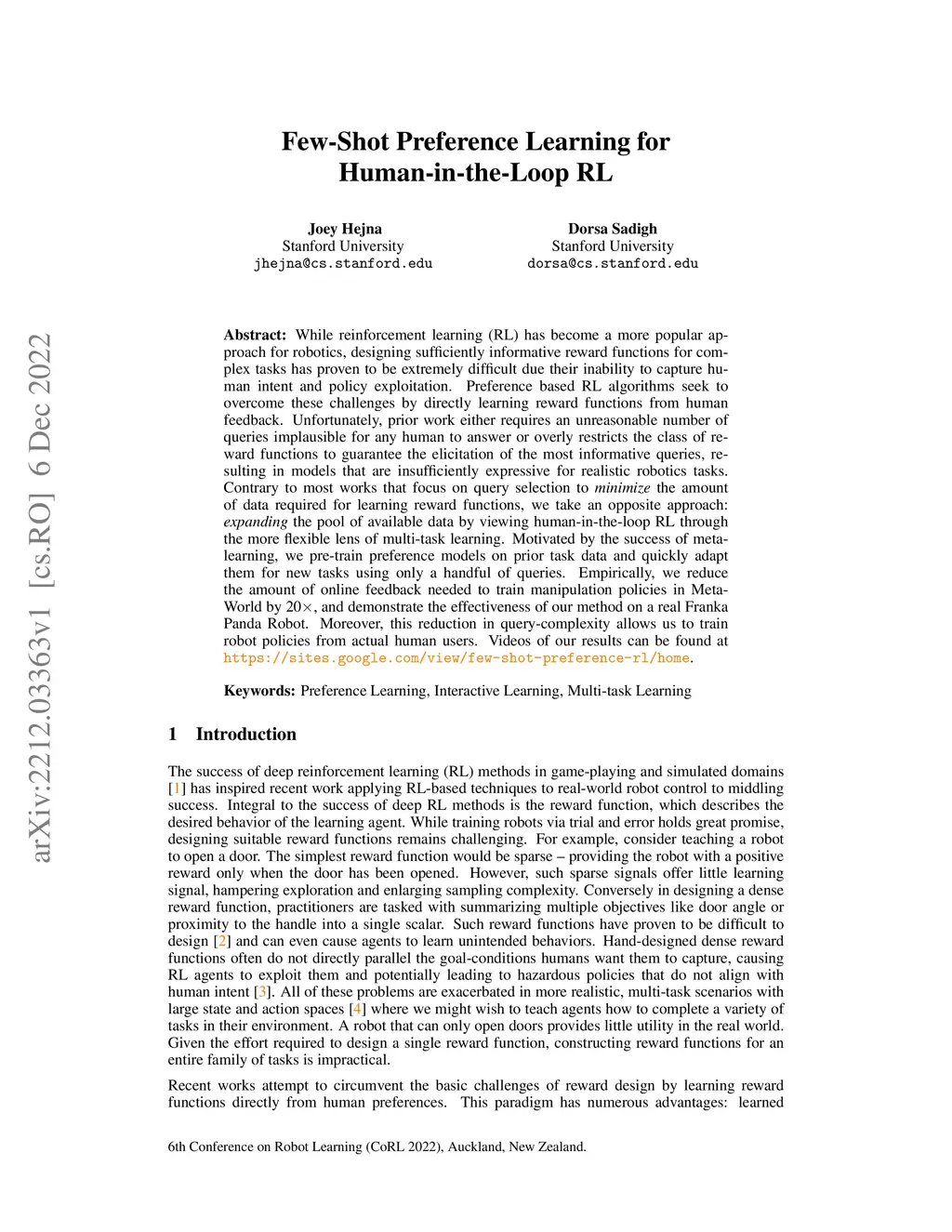 While reinforcement learning (RL) has become a more popular approach for robotics, designing sufficiently informative reward functions for complex tasks has proven to be extremely difficult due their inability to capture human intent and policy exploitation. Preference based RL algorithms seek to overcome these challenges by directly learning reward functions from human feedback. Unfortunately, prior work either requires an unreasonable number of queries implausible for any human to answer or overly restricts the class of reward functions to guarantee the elicitation of the most informative queries, resulting in models that are insufficiently expressive for realistic robotics tasks. Contrary to most works that focus on query selection to \emph{minimize} the amount of data required for learning reward functions, we take an opposite approach: \emph{expanding} the pool of available data by viewing human-in-the-loop RL through the more flexible lens of multi-task learning. Motivated by the success of meta-learning, we pre-train preference models on prior task data and quickly adapt them for new tasks using only a handful of queries. Empirically, we reduce the amount of online feedback needed to train manipulation policies in Meta-World by 20, and demonstrate the effectiveness of our method on a real Franka Panda Robot. Moreover, this reduction in query-complexity allows us to train robot policies from actual human users. Videos of our results and code can be found at https://sites.google.com/view/few-shot-preference-rl/home.
