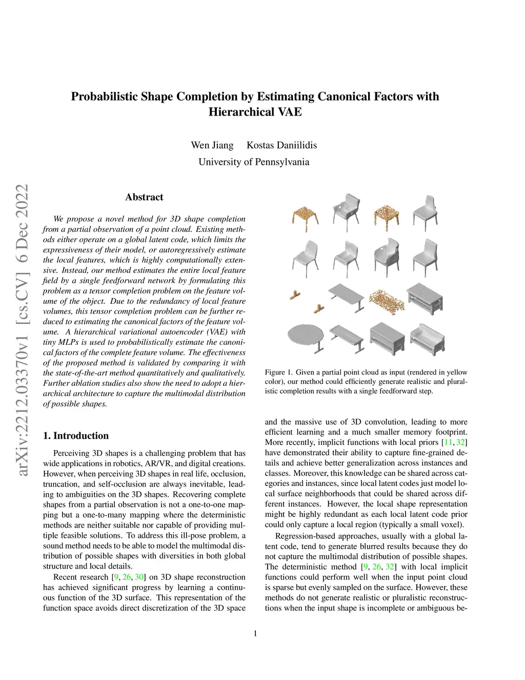 We propose a novel method for 3D shape completion from a partial observation of a point cloud. Existing methods either operate on a global latent code, which limits the expressiveness of their model, or autoregressively estimate the local features, which is highly computationally extensive. Instead, our method estimates the entire local feature field by a single feedforward network by formulating this problem as a tensor completion problem on the feature volume of the object. Due to the redundancy of local feature volumes, this tensor completion problem can be further reduced to estimating the canonical factors of the feature volume. A hierarchical variational autoencoder (VAE) with tiny MLPs is used to probabilistically estimate the canonical factors of the complete feature volume. The effectiveness of the proposed method is validated by comparing it with the state-of-the-art method quantitatively and qualitatively. Further ablation studies also show the need to adopt a hierarchical architecture to capture the multimodal distribution of possible shapes.
