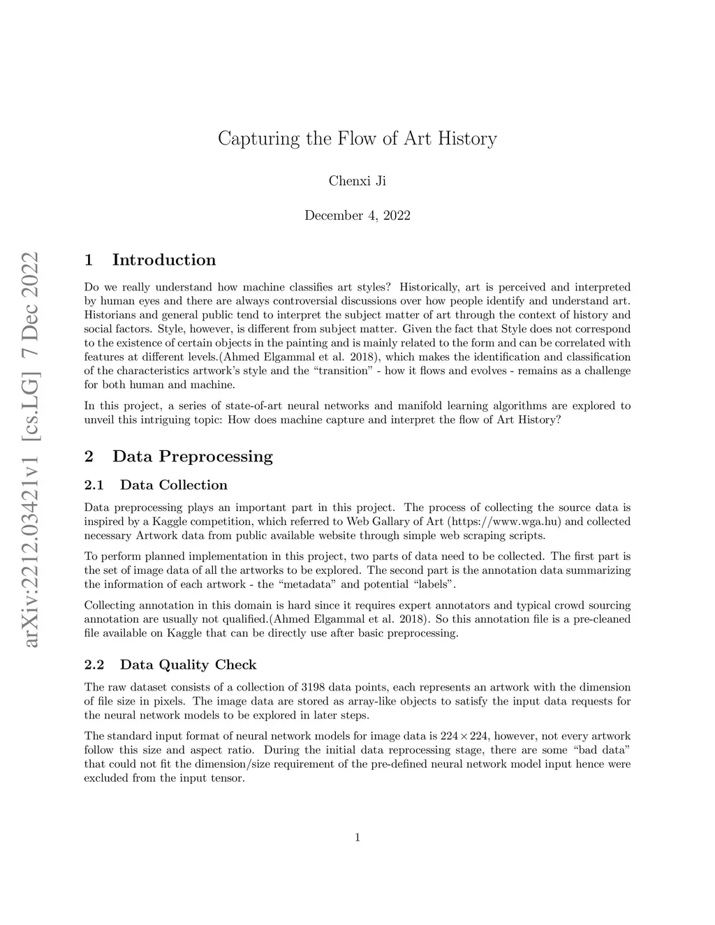 Do we really understand how machine classifies art styles? Historically, art is perceived and interpreted by human eyes and there are always controversial discussions over how people identify and understand art. Historians and general public tend to interpret the subject matter of art through the context of history and social factors. Style, however, is different from subject matter. Given the fact that Style does not correspond to the existence of certain objects in the painting and is mainly related to the form and can be correlated with features at different levels.(Ahmed Elgammal et al. 2018), which makes the identification and classification of the characteristics artwork's style and the "transition" - how it flows and evolves - remains as a challenge for both human and machine. In this work, a series of state-of-art neural networks and manifold learning algorithms are explored to unveil this intriguing topic: How does machine capture and interpret the flow of Art History?