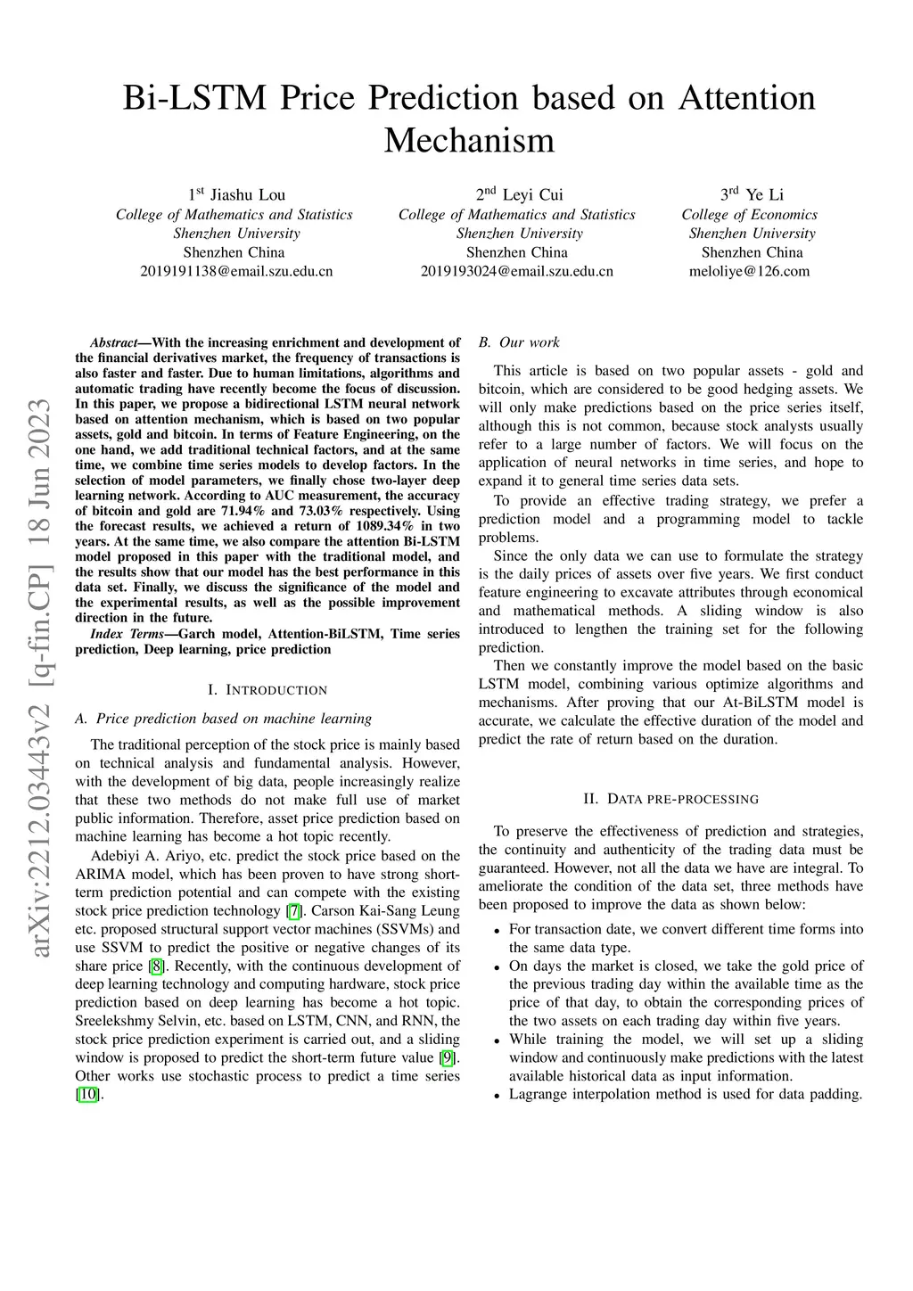 With the increasing enrichment and development of the financial derivatives market, the frequency of transactions is also faster and faster. Due to human limitations, algorithms and automatic trading have recently become the focus of discussion. In this paper, we propose a bidirectional LSTM neural network based on an attention mechanism, which is based on two popular assets, gold and bitcoin. In terms of Feature Engineering, on the one hand, we add traditional technical factors, and at the same time, we combine time series models to develop factors. In the selection of model parameters, we finally chose a two-layer deep learning network. According to AUC measurement, the accuracy of bitcoin and gold is 71.94% and 73.03% respectively. Using the forecast results, we achieved a return of 1089.34% in two years. At the same time, we also compare the attention Bi-LSTM model proposed in this paper with the traditional model, and the results show that our model has the best performance in this data set. Finally, we discuss the significance of the model and the experimental results, as well as the possible improvement direction in the future.