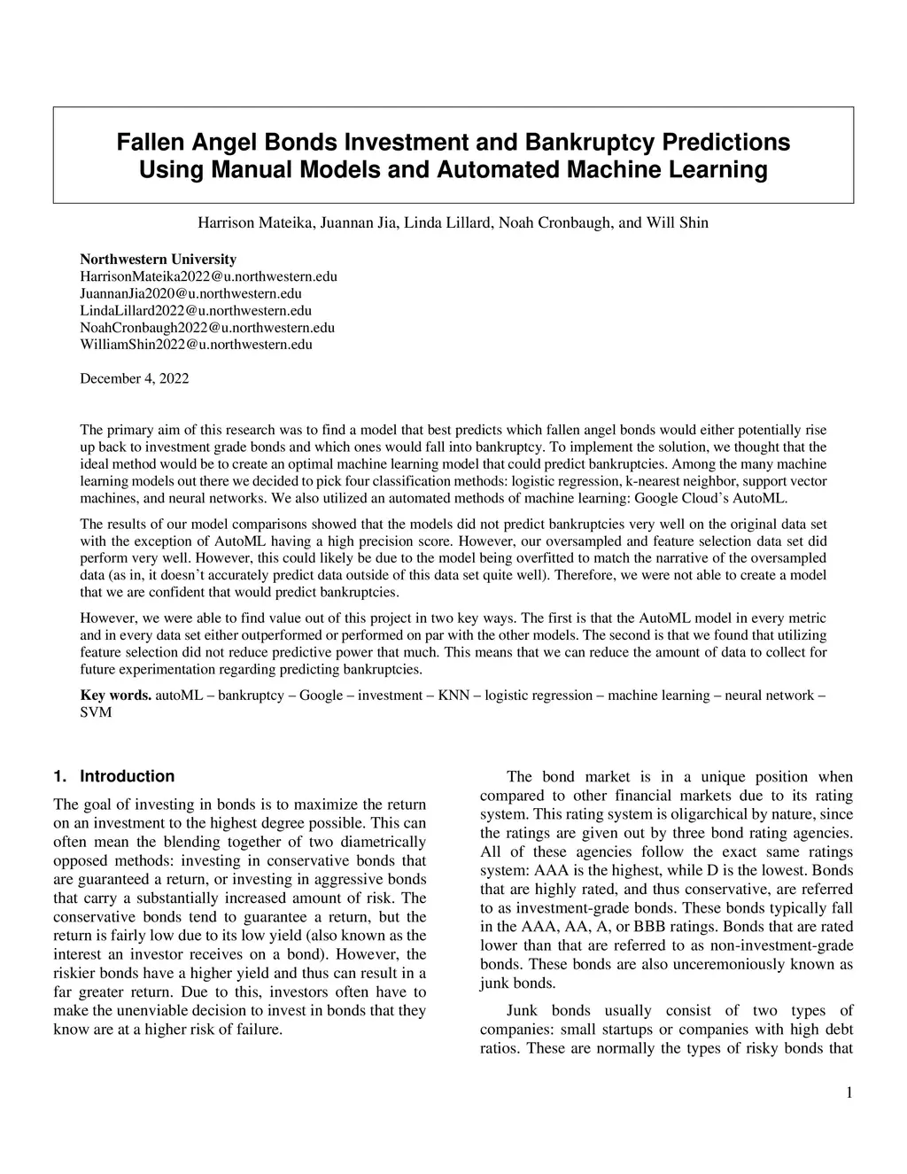 The primary aim of this research was to find a model that best predicts which fallen angel bonds would either potentially rise up back to investment grade bonds and which ones would fall into bankruptcy. To implement the solution, we thought that the ideal method would be to create an optimal machine learning model that could predict bankruptcies. Among the many machine learning models out there we decided to pick four classification methods: logistic regression, KNN, SVM, and NN. We also utilized an automated methods of Google Cloud's machine learning. The results of our model comparisons showed that the models did not predict bankruptcies very well on the original data set with the exception of Google Cloud's machine learning having a high precision score. However, our over-sampled and feature selection data set did perform very well. This could likely be due to the model being over-fitted to match the narrative of the over-sampled data (as in, it does not accurately predict data outside of this data set quite well). Therefore, we were not able to create a model that we are confident that would predict bankruptcies. However, we were able to find value out of this project in two key ways. The first is that Google Cloud's machine learning model in every metric and in every data set either outperformed or performed on par with the other models. The second is that we found that utilizing feature selection did not reduce predictive power that much. This means that we can reduce the amount of data to collect for future experimentation regarding predicting bankruptcies.