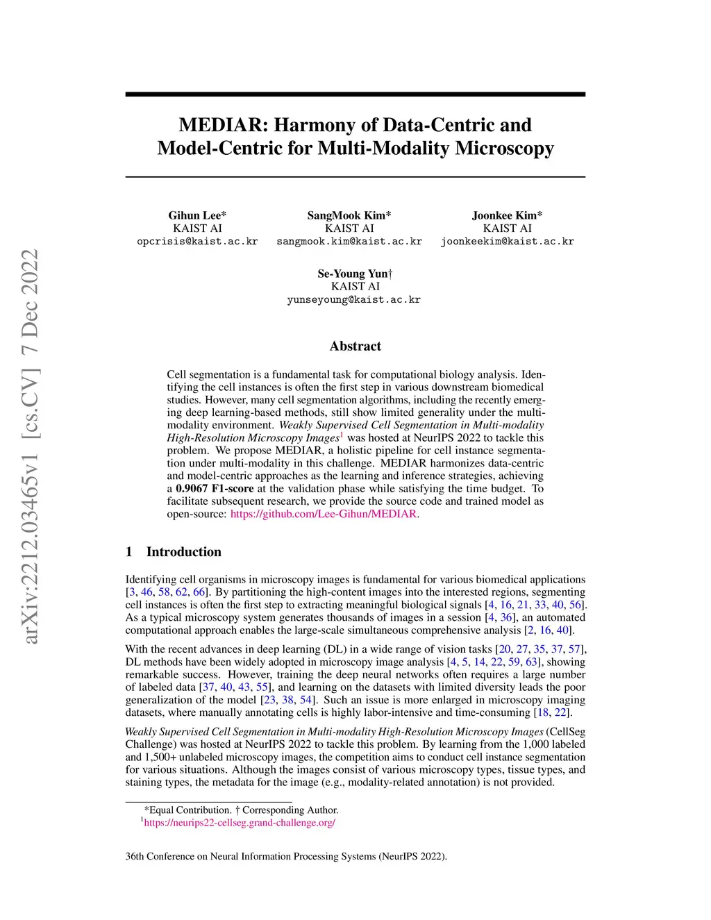 Cell segmentation is a fundamental task for computational biology analysis. Identifying the cell instances is often the first step in various downstream biomedical studies. However, many cell segmentation algorithms, including the recently emerging deep learning-based methods, still show limited generality under the multi-modality environment. Weakly Supervised Cell Segmentation in Multi-modality High-Resolution Microscopy Images was hosted at NeurIPS 2022 to tackle this problem. We propose MEDIAR, a holistic pipeline for cell instance segmentation under multi-modality in this challenge. MEDIAR harmonizes data-centric and model-centric approaches as the learning and inference strategies, achieving a 0.9067 F1-score at the validation phase while satisfying the time budget. To facilitate subsequent research, we provide the source code and trained model as open-source: https://github.com/Lee-Gihun/MEDIAR