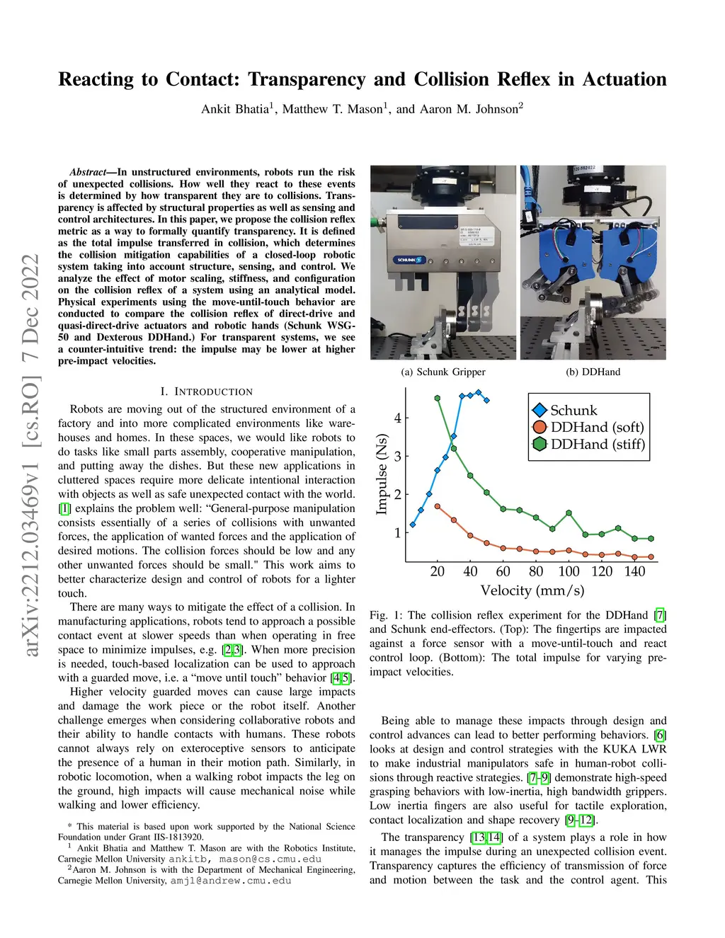 In unstructured environments, robots run the risk of unexpected collisions. How well they react to these events is determined by how transparent they are to collisions. Transparency is affected by structural properties as well as sensing and control architectures. In this paper, we propose the collision reflex metric as a way to formally quantify transparency. It is defined as the total impulse transferred in collision, which determines the collision mitigation capabilities of a closed-loop robotic system taking into account structure, sensing, and control. We analyze the effect of motor scaling, stiffness, and configuration on the collision reflex of a system using an analytical model. Physical experiments using the move-until-touch behavior are conducted to compare the collision reflex of direct-drive and quasi-direct-drive actuators and robotic hands (Schunk WSG-50 and Dexterous DDHand.) For transparent systems, we see a counter-intuitive trend: the impulse may be lower at higher pre-impact velocities.
