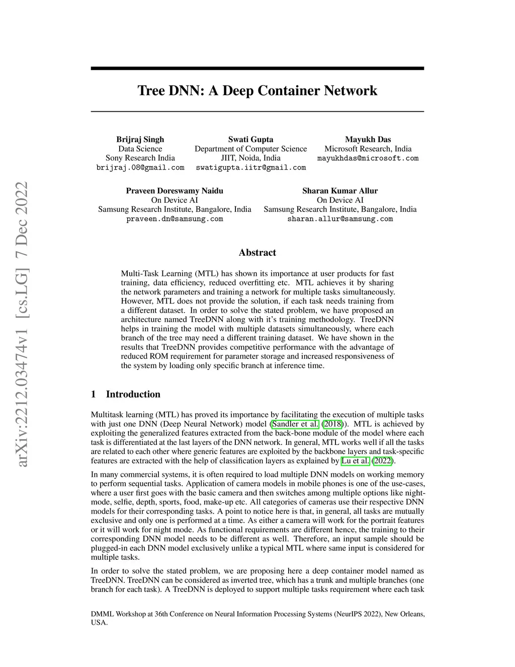 Multi-Task Learning (MTL) has shown its importance at user products for fast training, data efficiency, reduced overfitting etc. MTL achieves it by sharing the network parameters and training a network for multiple tasks simultaneously. However, MTL does not provide the solution, if each task needs training from a different dataset. In order to solve the stated problem, we have proposed an architecture named TreeDNN along with it's training methodology. TreeDNN helps in training the model with multiple datasets simultaneously, where each branch of the tree may need a different training dataset. We have shown in the results that TreeDNN provides competitive performance with the advantage of reduced ROM requirement for parameter storage and increased responsiveness of the system by loading only specific branch at inference time.
