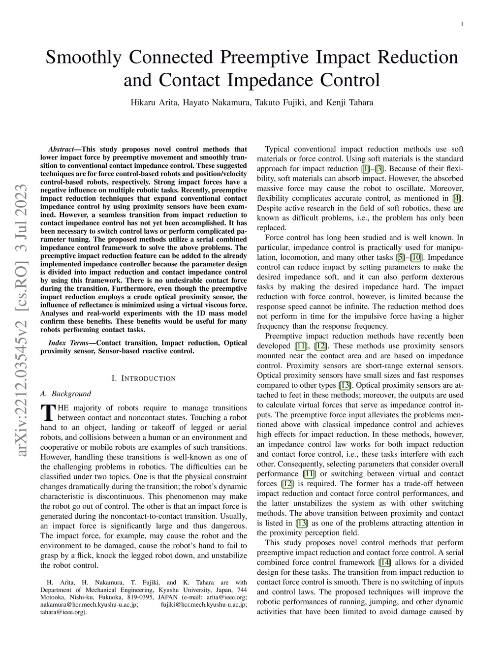 This study proposes novel control methods that lower impact force by preemptive movement and smoothly transition to conventional contact impedance control. These suggested techniques are for force control-based robots and position/velocity control-based robots, respectively. Strong impact forces have a negative influence on multiple robotic tasks. Recently, preemptive impact reduction techniques that expand conventional contact impedance control by using proximity sensors have been examined. However, a seamless transition from impact reduction to contact impedance control has not yet been accomplished. The proposed methods utilize a serial combined impedance control framework to solve this problem. The preemptive impact reduction feature can be added to the already implemented impedance controller because the parameter design is divided into impact reduction and contact impedance control. There is no undesirable contact force during the transition. Furthermore, even though the preemptive impact reduction employs a crude optical proximity sensor, the influence of reflectance is minimized using a virtual viscous force. Analyses and real-world experiments confirm these benefits.
