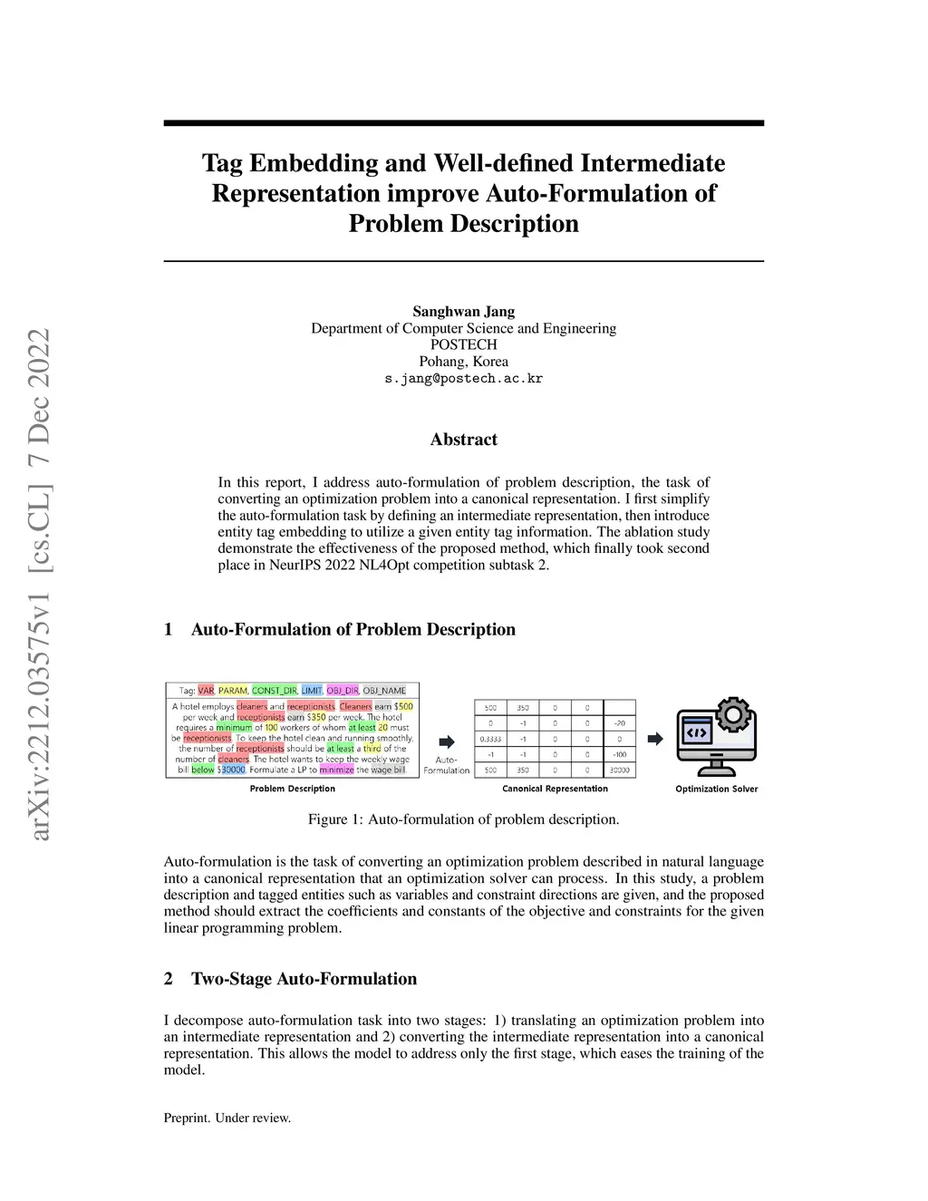 In this report, I address auto-formulation of problem description, the task of converting an optimization problem into a canonical representation. I first simplify the auto-formulation task by defining an intermediate representation, then introduce entity tag embedding to utilize a given entity tag information. The ablation study demonstrate the effectiveness of the proposed method, which finally took second place in NeurIPS 2022 NL4Opt competition subtask 2.