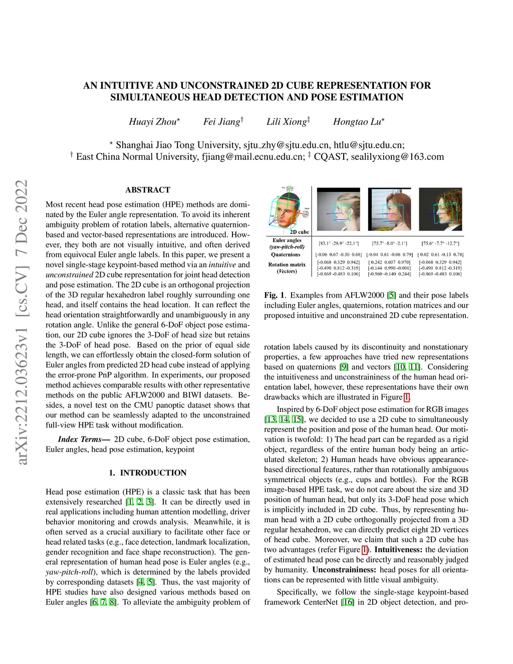 Most recent head pose estimation (HPE) methods are dominated by the Euler angle representation. To avoid its inherent ambiguity problem of rotation labels, alternative quaternion-based and vector-based representations are introduced. However, they both are not visually intuitive, and often derived from equivocal Euler angle labels. In this paper, we present a novel single-stage keypoint-based method via an {\it intuitive} and {\it unconstrained} 2D cube representation for joint head detection and pose estimation. The 2D cube is an orthogonal projection of the 3D regular hexahedron label roughly surrounding one head, and itself contains the head location. It can reflect the head orientation straightforwardly and unambiguously in any rotation angle. Unlike the general 6-DoF object pose estimation, our 2D cube ignores the 3-DoF of head size but retains the 3-DoF of head pose. Based on the prior of equal side length, we can effortlessly obtain the closed-form solution of Euler angles from predicted 2D head cube instead of applying the error-prone PnP algorithm. In experiments, our proposed method achieves comparable results with other representative methods on the public AFLW2000 and BIWI datasets. Besides, a novel test on the CMU panoptic dataset shows that our method can be seamlessly adapted to the unconstrained full-view HPE task without modification.