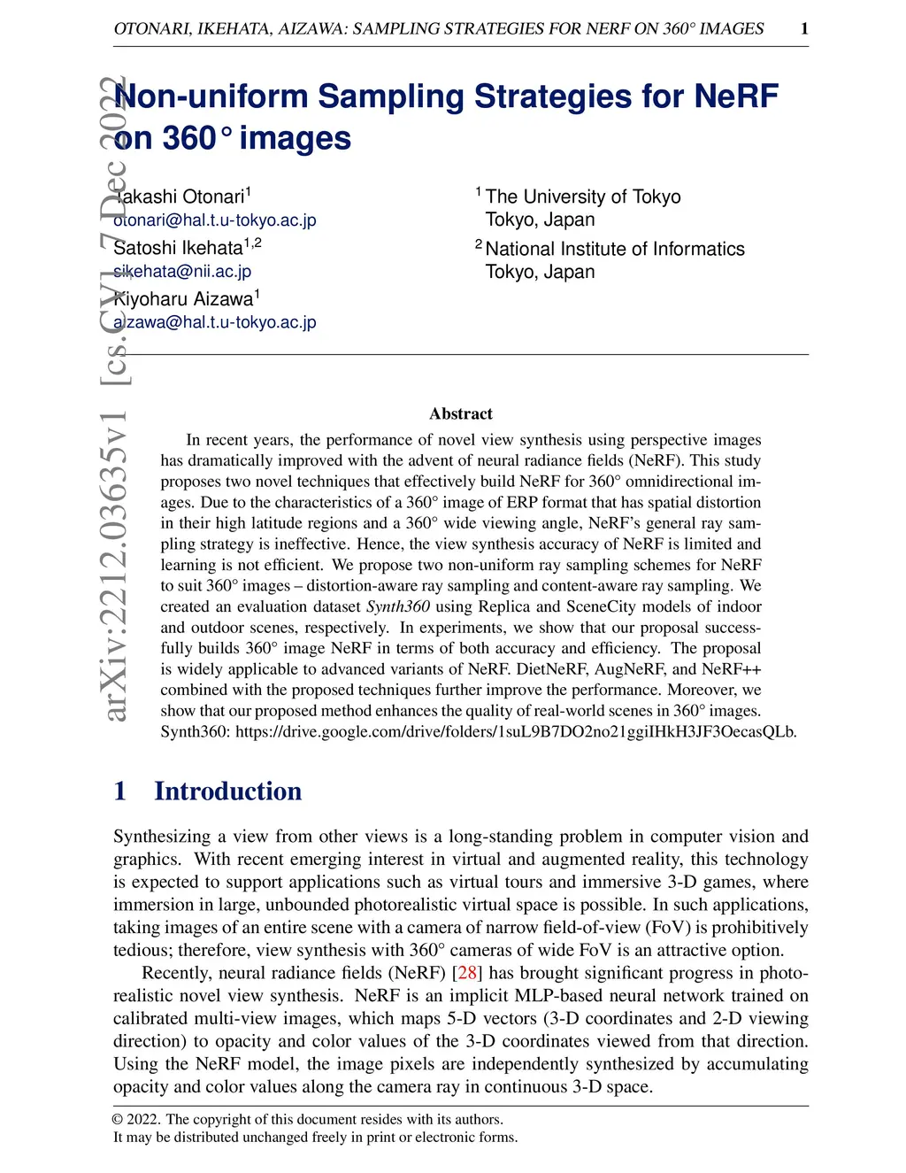 In recent years, the performance of novel view synthesis using perspective images has dramatically improved with the advent of neural radiance fields (NeRF). This study proposes two novel techniques that effectively build NeRF for 360{\textdegree} omnidirectional images. Due to the characteristics of a 360{\textdegree} image of ERP format that has spatial distortion in their high latitude regions and a 360{\textdegree} wide viewing angle, NeRF's general ray sampling strategy is ineffective. Hence, the view synthesis accuracy of NeRF is limited and learning is not efficient. We propose two non-uniform ray sampling schemes for NeRF to suit 360{\textdegree} images - distortion-aware ray sampling and content-aware ray sampling. We created an evaluation dataset Synth360 using Replica and SceneCity models of indoor and outdoor scenes, respectively. In experiments, we show that our proposal successfully builds 360{\textdegree} image NeRF in terms of both accuracy and efficiency. The proposal is widely applicable to advanced variants of NeRF. DietNeRF, AugNeRF, and NeRF++ combined with the proposed techniques further improve the performance. Moreover, we show that our proposed method enhances the quality of real-world scenes in 360{\textdegree} images. Synth360: https://drive.google.com/drive/folders/1suL9B7DO2no21ggiIHkH3JF3OecasQLb.