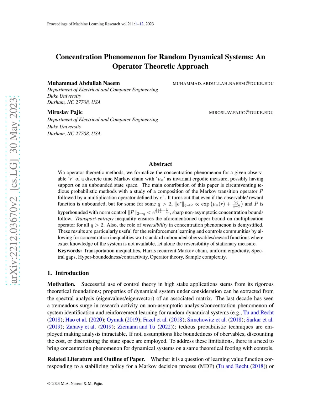 Via operator theoretic methods, we formalize the concentration phenomenon for a given observable `' of a discrete time Markov chain with `' as invariant ergodic measure, possibly having support on an unbounded state space. The main contribution of this paper is circumventing tedious probabilistic methods with a study of a composition of the Markov transition operator followed by a multiplication operator defined by . It turns out that even if the observable/ reward function is unbounded, but for some for some , $\|e^{r}\|_{q \rightarrow 2} \propto \exp\big(\mu_{\pi}(r) +\frac{2q}{q-2}\big) $ and is hyperbounded with norm control , sharp non-asymptotic concentration bounds follow. \emph{Transport-entropy} inequality ensures the aforementioned upper bound on multiplication operator for all . The role of \emph{reversibility} in concentration phenomenon is demystified. These results are particularly useful for the reinforcement learning and controls communities as they allow for concentration inequalities w.r.t standard unbounded obersvables/reward functions where exact knowledge of the system is not available, let alone the reversibility of stationary measure.