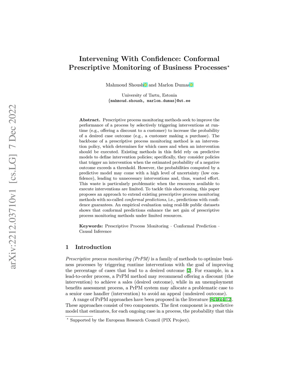 Prescriptive process monitoring methods seek to improve the performance of a process by selectively triggering interventions at runtime (e.g., offering a discount to a customer) to increase the probability of a desired case outcome (e.g., a customer making a purchase). The backbone of a prescriptive process monitoring method is an intervention policy, which determines for which cases and when an intervention should be executed. Existing methods in this field rely on predictive models to define intervention policies; specifically, they consider policies that trigger an intervention when the estimated probability of a negative outcome exceeds a threshold. However, the probabilities computed by a predictive model may come with a high level of uncertainty (low confidence), leading to unnecessary interventions and, thus, wasted effort. This waste is particularly problematic when the resources available to execute interventions are limited. To tackle this shortcoming, this paper proposes an approach to extend existing prescriptive process monitoring methods with so-called conformal predictions, i.e., predictions with confidence guarantees. An empirical evaluation using real-life public datasets shows that conformal predictions enhance the net gain of prescriptive process monitoring methods under limited resources.