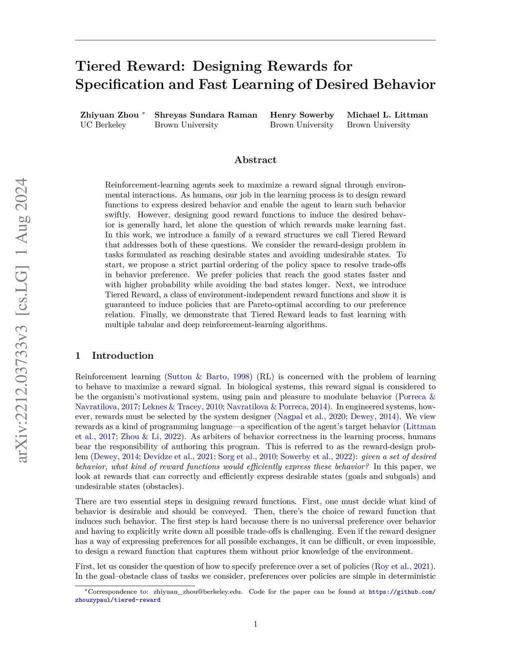 Reinforcement-learning agents seek to maximize a reward signal through environmental interactions. As humans, our job in the learning process is to design reward functions to express desired behavior and enable the agent to learn such behavior swiftly. In this work, we consider the reward-design problem in tasks formulated as reaching desirable states and avoiding undesirable states. To start, we propose a strict partial ordering of the policy space to resolve trade-offs in behavior preference. We prefer policies that reach the good states faster and with higher probability while avoiding the bad states longer. Next, we introduce Tiered Reward, a class of environment-independent reward functions and show it is guaranteed to induce policies that are Pareto-optimal according to our preference relation. Finally, we demonstrate that Tiered Reward can lead to fast learning by evaluating on several environments using multiple tabular and deep reinforcement-learning algorithms.
