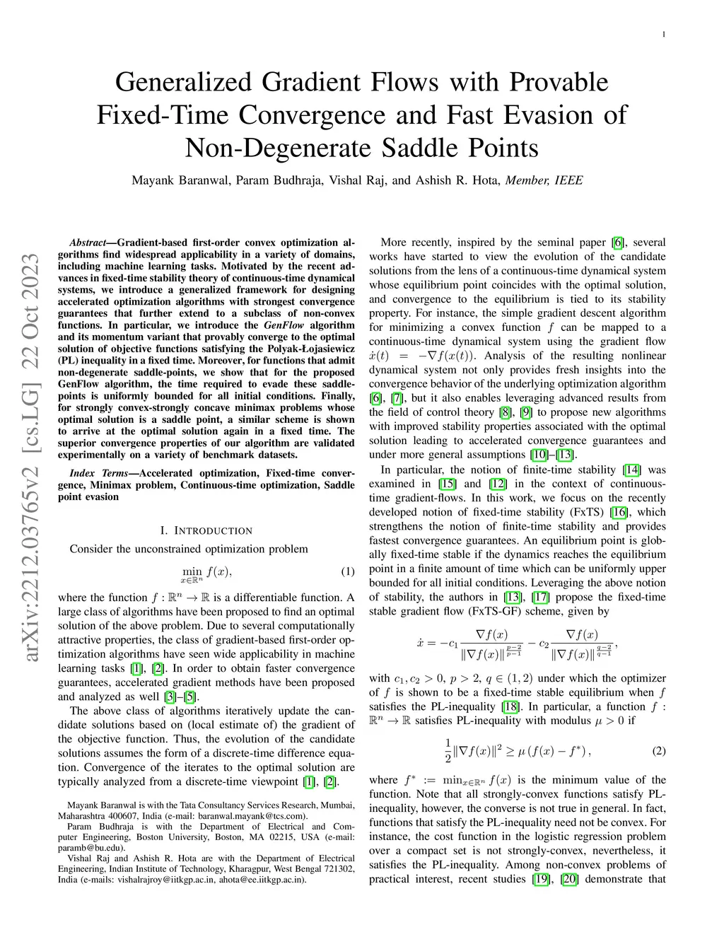 Gradient-based first-order convex optimization algorithms find widespread applicability in a variety of domains, including machine learning tasks. Motivated by the recent advances in fixed-time stability theory of continuous-time dynamical systems, we introduce a generalized framework for designing accelerated optimization algorithms with strongest convergence guarantees that further extend to a subclass of non-convex functions. In particular, we introduce the GenFlow algorithm and its momentum variant that provably converge to the optimal solution of objective functions satisfying the Polyak-{\L}ojasiewicz (PL) inequality in a fixed time. Moreover, for functions that admit non-degenerate saddle-points, we show that for the proposed GenFlow algorithm, the time required to evade these saddle-points is uniformly bounded for all initial conditions. Finally, for strongly convex-strongly concave minimax problems whose optimal solution is a saddle point, a similar scheme is shown to arrive at the optimal solution again in a fixed time. The superior convergence properties of our algorithm are validated experimentally on a variety of benchmark datasets.