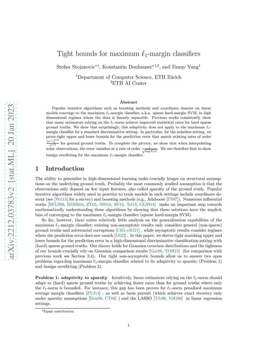 Popular iterative algorithms such as boosting methods and coordinate descent on linear models converge to the maximum -margin classifier, a.k.a. sparse hard-margin SVM, in high dimensional regimes where the data is linearly separable. Previous works consistently show that many estimators relying on the -norm achieve improved statistical rates for hard sparse ground truths. We show that surprisingly, this adaptivity does not apply to the maximum -margin classifier for a standard discriminative setting. In particular, for the noiseless setting, we prove tight upper and lower bounds for the prediction error that match existing rates of order for general ground truths. To complete the picture, we show that when interpolating noisy observations, the error vanishes at a rate of order . We are therefore first to show benign overfitting for the maximum -margin classifier.
