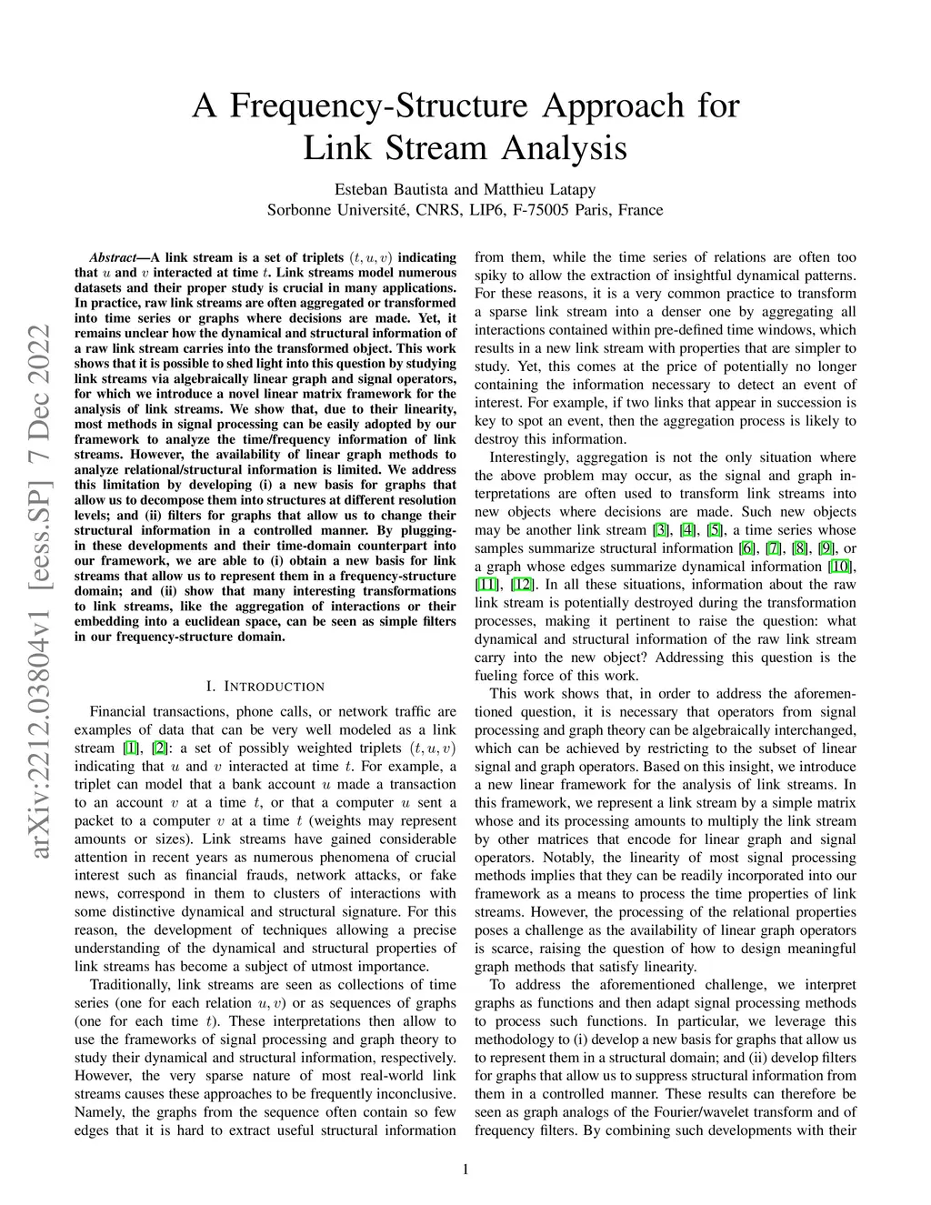 A link stream is a set of triplets indicating that and interacted at time . Link streams model numerous datasets and their proper study is crucial in many applications. In practice, raw link streams are often aggregated or transformed into time series or graphs where decisions are made. Yet, it remains unclear how the dynamical and structural information of a raw link stream carries into the transformed object. This work shows that it is possible to shed light into this question by studying link streams via algebraically linear graph and signal operators, for which we introduce a novel linear matrix framework for the analysis of link streams. We show that, due to their linearity, most methods in signal processing can be easily adopted by our framework to analyze the time/frequency information of link streams. However, the availability of linear graph methods to analyze relational/structural information is limited. We address this limitation by developing (i) a new basis for graphs that allow us to decompose them into structures at different resolution levels; and (ii) filters for graphs that allow us to change their structural information in a controlled manner. By plugging-in these developments and their time-domain counterpart into our framework, we are able to (i) obtain a new basis for link streams that allow us to represent them in a frequency-structure domain; and (ii) show that many interesting transformations to link streams, like the aggregation of interactions or their embedding into a euclidean space, can be seen as simple filters in our frequency-structure domain.