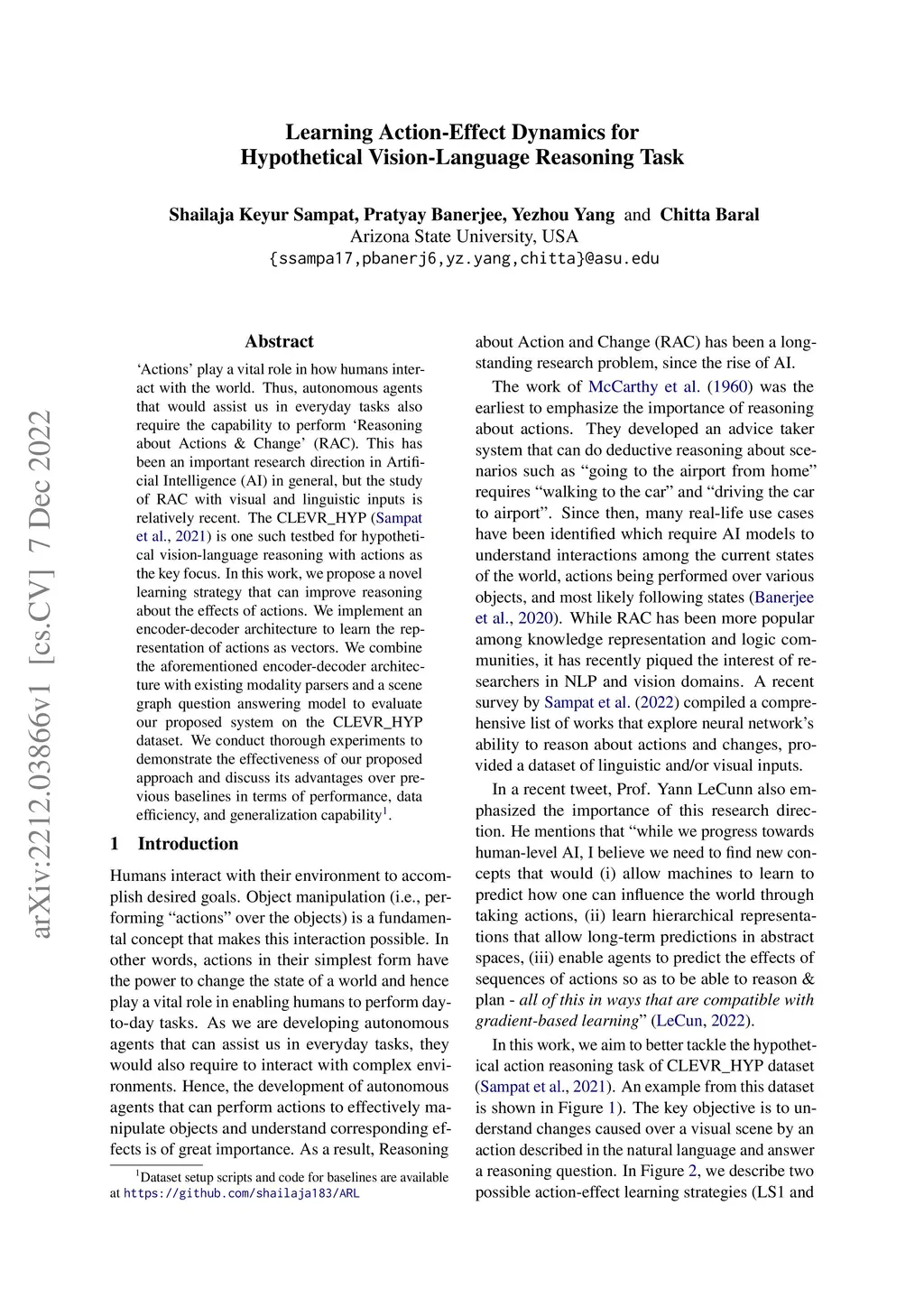 Áctions' play a vital role in how humans interact with the world. Thus, autonomous agents that would assist us in everyday tasks also require the capability to perform 'Reasoning about Actions & Change' (RAC). This has been an important research direction in Artificial Intelligence (AI) in general, but the study of RAC with visual and linguistic inputs is relatively recent. The CLEVR_HYP (Sampat et. al., 2021) is one such testbed for hypothetical vision-language reasoning with actions as the key focus. In this work, we propose a novel learning strategy that can improve reasoning about the effects of actions. We implement an encoder-decoder architecture to learn the representation of actions as vectors. We combine the aforementioned encoder-decoder architecture with existing modality parsers and a scene graph question answering model to evaluate our proposed system on the CLEVR_HYP dataset. We conduct thorough experiments to demonstrate the effectiveness of our proposed approach and discuss its advantages over previous baselines in terms of performance, data efficiency, and generalization capability.