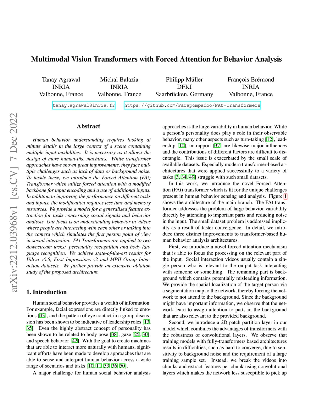 Human behavior understanding requires looking at minute details in the large context of a scene containing multiple input modalities. It is necessary as it allows the design of more human-like machines. While transformer approaches have shown great improvements, they face multiple challenges such as lack of data or background noise. To tackle these, we introduce the Forced Attention (FAt) Transformer which utilize forced attention with a modified backbone for input encoding and a use of additional inputs. In addition to improving the performance on different tasks and inputs, the modification requires less time and memory resources. We provide a model for a generalised feature extraction for tasks concerning social signals and behavior analysis. Our focus is on understanding behavior in videos where people are interacting with each other or talking into the camera which simulates the first person point of view in social interaction. FAt Transformers are applied to two downstream tasks: personality recognition and body language recognition. We achieve state-of-the-art results for Udiva v0.5, First Impressions v2 and MPII Group Interaction datasets. We further provide an extensive ablation study of the proposed architecture.