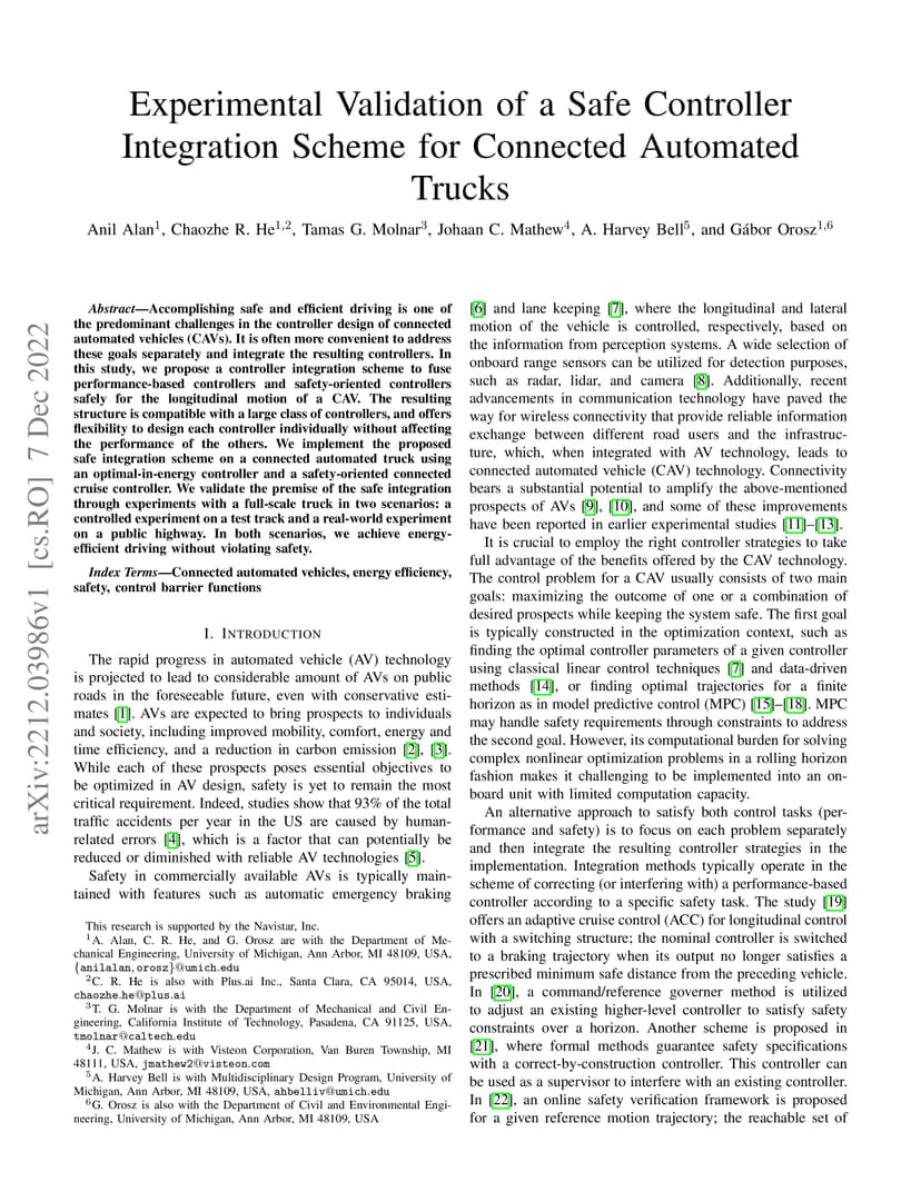 Accomplishing safe and efficient driving is one of the predominant challenges in the controller design of connected automated vehicles (CAVs). It is often more convenient to address these goals separately and integrate the resulting controllers. In this study, we propose a controller integration scheme to fuse performance-based controllers and safety-oriented controllers safely for the longitudinal motion of a CAV. The resulting structure is compatible with a large class of controllers, and offers flexibility to design each controller individually without affecting the performance of the others. We implement the proposed safe integration scheme on a connected automated truck using an optimal-in-energy controller and a safety-oriented connected cruise controller. We validate the premise of the safe integration through experiments with a full-scale truck in two scenarios: a controlled experiment on a test track and a real-world experiment on a public highway. In both scenarios, we achieve energy efficient driving without violating safety.