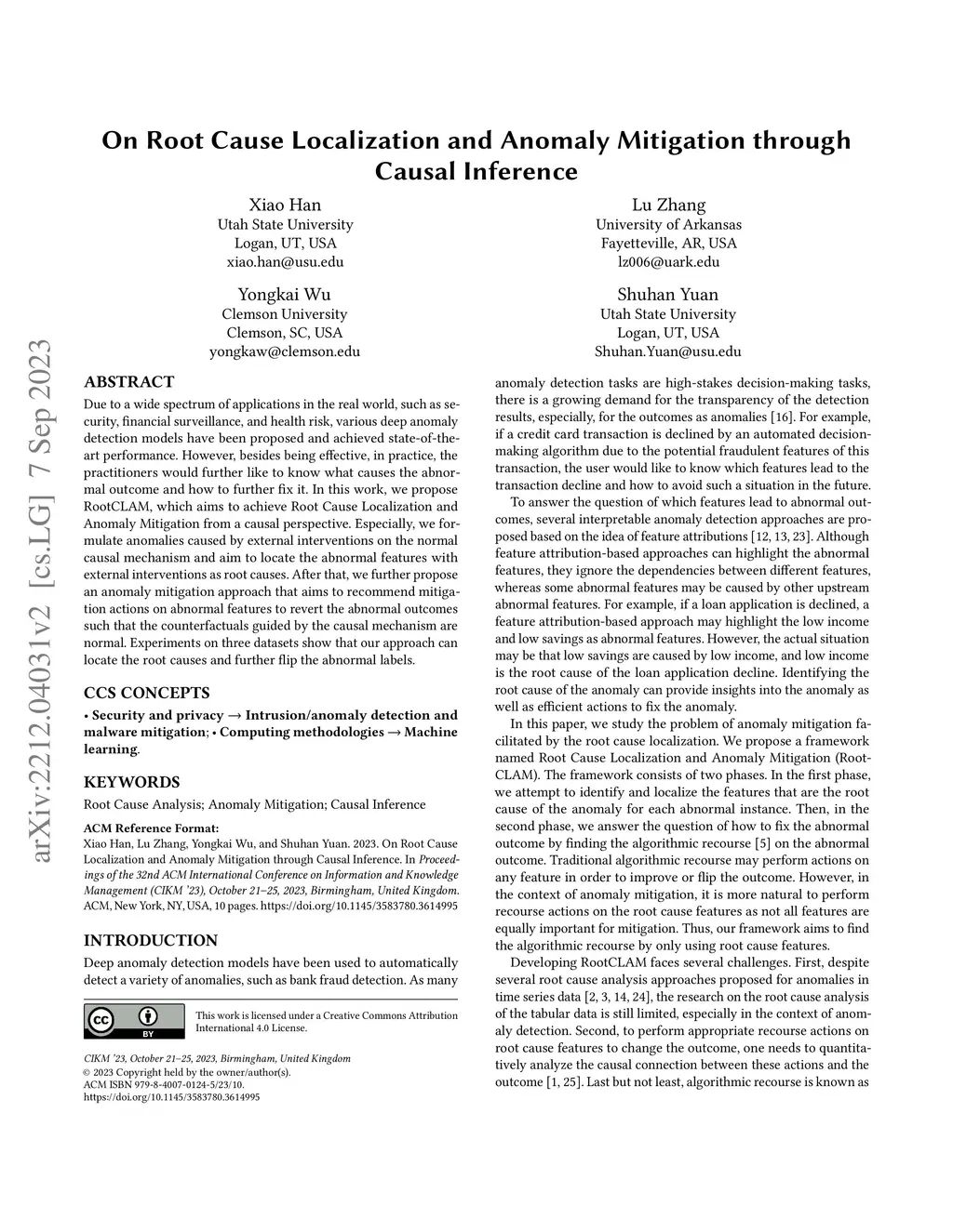 Due to a wide spectrum of applications in the real world, such as security, financial surveillance, and health risk, various deep anomaly detection models have been proposed and achieved state-of-the-art performance. However, besides being effective, in practice, the practitioners would further like to know what causes the abnormal outcome and how to further fix it. In this work, we propose RootCLAM, which aims to achieve Root Cause Localization and Anomaly Mitigation from a causal perspective. Especially, we formulate anomalies caused by external interventions on the normal causal mechanism and aim to locate the abnormal features with external interventions as root causes. After that, we further propose an anomaly mitigation approach that aims to recommend mitigation actions on abnormal features to revert the abnormal outcomes such that the counterfactuals guided by the causal mechanism are normal. Experiments on three datasets show that our approach can locate the root causes and further flip the abnormal labels.