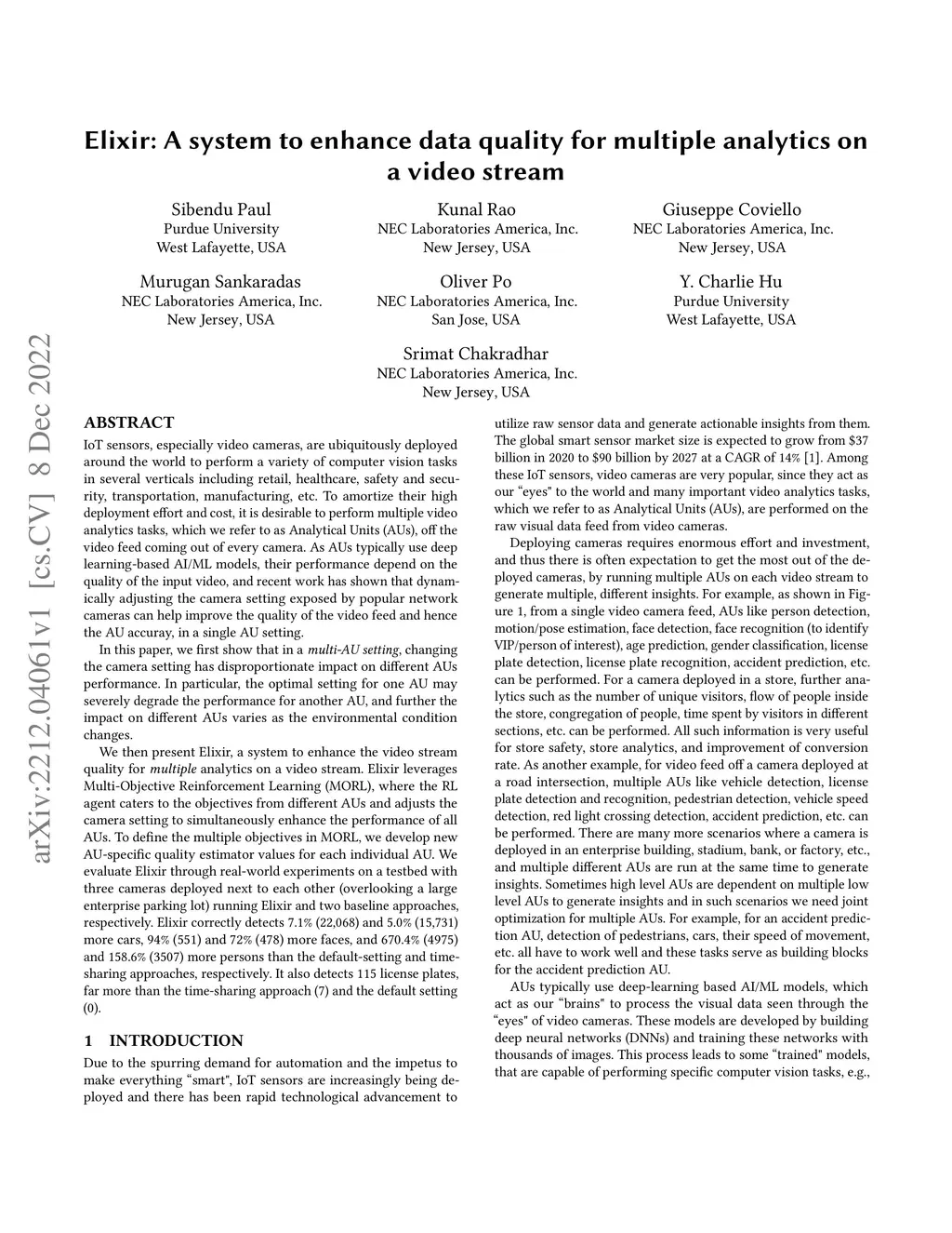 IoT sensors, especially video cameras, are ubiquitously deployed around the world to perform a variety of computer vision tasks in several verticals including retail, healthcare, safety and security, transportation, manufacturing, etc. To amortize their high deployment effort and cost, it is desirable to perform multiple video analytics tasks, which we refer to as Analytical Units (AUs), off the video feed coming out of every camera. In this paper, we first show that in a multi-AU setting, changing the camera setting has disproportionate impact on different AUs performance. In particular, the optimal setting for one AU may severely degrade the performance for another AU, and further the impact on different AUs varies as the environmental condition changes. We then present Elixir, a system to enhance the video stream quality for multiple analytics on a video stream. Elixir leverages Multi-Objective Reinforcement Learning (MORL), where the RL agent caters to the objectives from different AUs and adjusts the camera setting to simultaneously enhance the performance of all AUs. To define the multiple objectives in MORL, we develop new AU-specific quality estimator values for each individual AU. We evaluate Elixir through real-world experiments on a testbed with three cameras deployed next to each other (overlooking a large enterprise parking lot) running Elixir and two baseline approaches, respectively. Elixir correctly detects 7.1% (22,068) and 5.0% (15,731) more cars, 94% (551) and 72% (478) more faces, and 670.4% (4975) and 158.6% (3507) more persons than the default-setting and time-sharing approaches, respectively. It also detects 115 license plates, far more than the time-sharing approach (7) and the default setting (0).