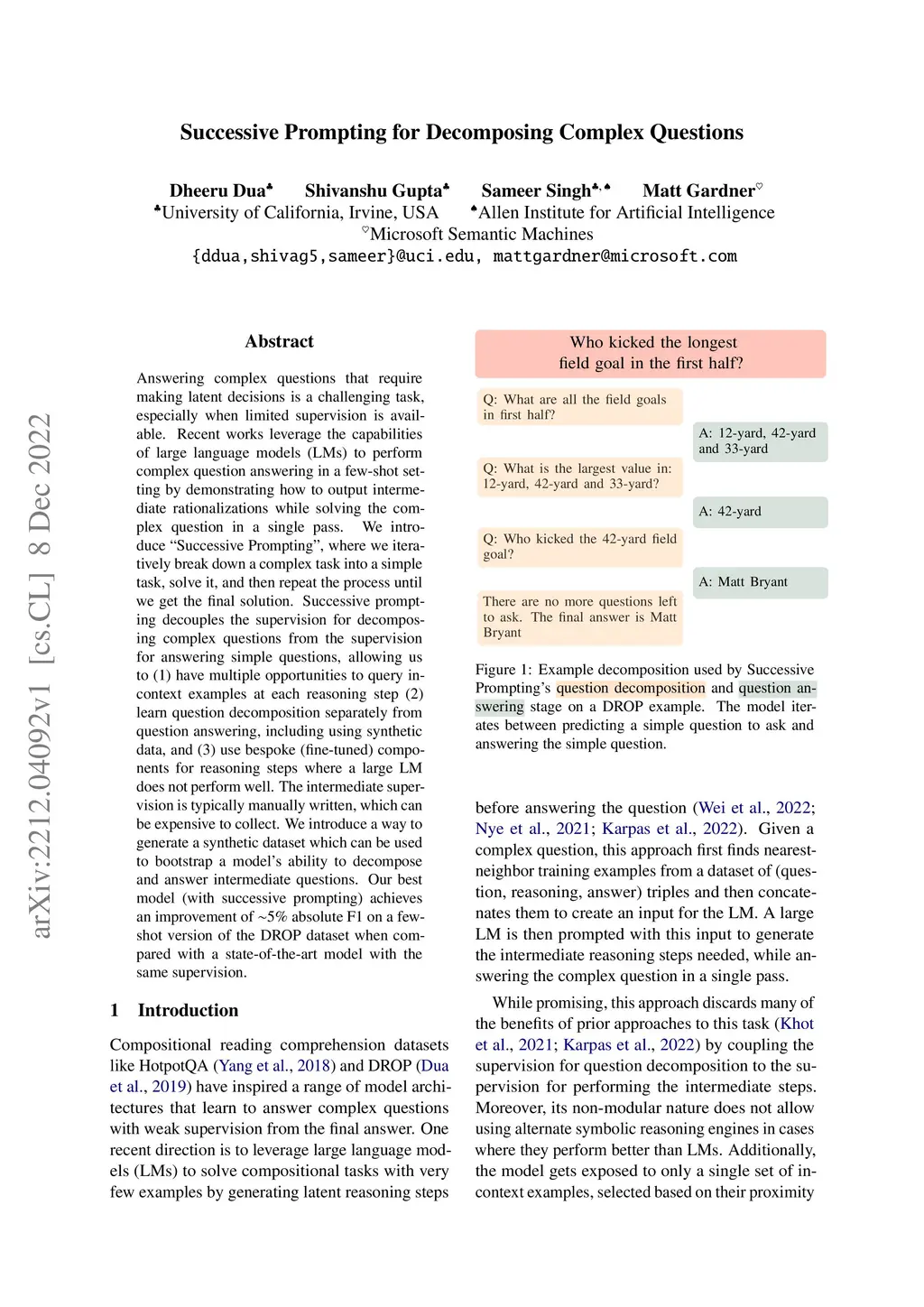 Answering complex questions that require making latent decisions is a challenging task, especially when limited supervision is available. Recent works leverage the capabilities of large language models (LMs) to perform complex question answering in a few-shot setting by demonstrating how to output intermediate rationalizations while solving the complex question in a single pass. We introduce ``Successive Prompting'', where we iteratively break down a complex task into a simple task, solve it, and then repeat the process until we get the final solution. Successive prompting decouples the supervision for decomposing complex questions from the supervision for answering simple questions, allowing us to (1) have multiple opportunities to query in-context examples at each reasoning step (2) learn question decomposition separately from question answering, including using synthetic data, and (3) use bespoke (fine-tuned) components for reasoning steps where a large LM does not perform well. The intermediate supervision is typically manually written, which can be expensive to collect. We introduce a way to generate a synthetic dataset which can be used to bootstrap a model's ability to decompose and answer intermediate questions. Our best model (with successive prompting) achieves an improvement of ~5% absolute F1 on a few-shot version of the DROP dataset when compared with a state-of-the-art model with the same supervision.