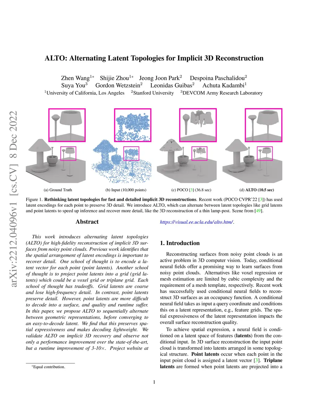This work introduces alternating latent topologies (ALTO) for high-fidelity reconstruction of implicit 3D surfaces from noisy point clouds. Previous work identifies that the spatial arrangement of latent encodings is important to recover detail. One school of thought is to encode a latent vector for each point (point latents). Another school of thought is to project point latents into a grid (grid latents) which could be a voxel grid or triplane grid. Each school of thought has tradeoffs. Grid latents are coarse and lose high-frequency detail. In contrast, point latents preserve detail. However, point latents are more difficult to decode into a surface, and quality and runtime suffer. In this paper, we propose ALTO to sequentially alternate between geometric representations, before converging to an easy-to-decode latent. We find that this preserves spatial expressiveness and makes decoding lightweight. We validate ALTO on implicit 3D recovery and observe not only a performance improvement over the state-of-the-art, but a runtime improvement of 3-10. Project website at https://visual.ee.ucla.edu/alto.htm/.