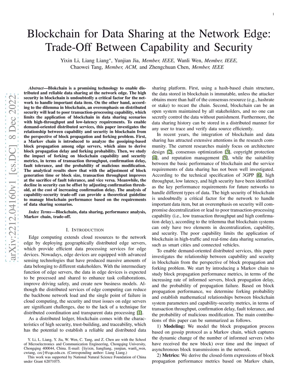 Blokchain is a promising technology to enable distributed and reliable data sharing at the network edge. The high security in blockchain is undoubtedly a critical factor for the network to handle important data item. On the other hand, according to the dilemma in blockchain, an overemphasis on distributed security will lead to poor transaction-processing capability, which limits the application of blockchain in data sharing scenarios with high-throughput and low-latency requirements. To enable demand-oriented distributed services, this paper investigates the relationship between capability and security in blockchain from the perspective of block propagation and forking problem. First, a Markov chain is introduced to analyze the gossiping-based block propagation among edge servers, which aims to derive block propagation delay and forking probability. Then, we study the impact of forking on blockchain capability and security metrics, in terms of transaction throughput, confirmation delay, fault tolerance, and the probability of malicious modification. The analytical results show that with the adjustment of block generation time or block size, transaction throughput improves at the sacrifice of fault tolerance, and vice versa. Meanwhile, the decline in security can be offset by adjusting confirmation threshold, at the cost of increasing confirmation delay. The analysis of capability-security trade-off can provide a theoretical guideline to manage blockchain performance based on the requirements of data sharing scenarios.
