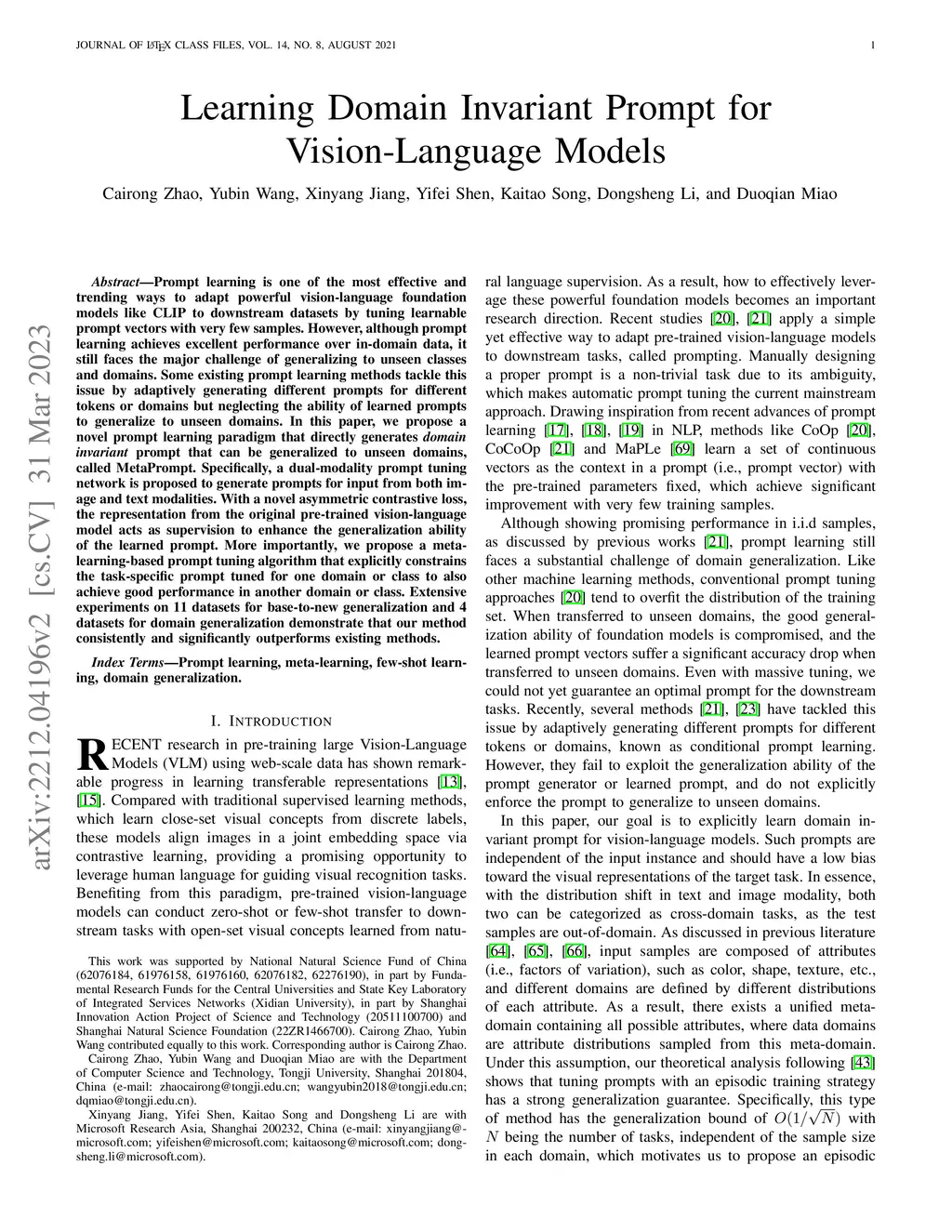 Prompt learning is one of the most effective and trending ways to adapt powerful vision-language foundation models like CLIP to downstream datasets by tuning learnable prompt vectors with very few samples. However, although prompt learning achieves excellent performance over in-domain data, it still faces the major challenge of generalizing to unseen classes and domains. Some existing prompt learning methods tackle this issue by adaptively generating different prompts for different tokens or domains but neglecting the ability of learned prompts to generalize to unseen domains. In this paper, we propose a novel prompt learning paradigm that directly generates \emph{domain invariant} prompt that can be generalized to unseen domains, called MetaPrompt. Specifically, a dual-modality prompt tuning network is proposed to generate prompts for input from both image and text modalities. With a novel asymmetric contrastive loss, the representation from the original pre-trained vision-language model acts as supervision to enhance the generalization ability of the learned prompt. More importantly, we propose a meta-learning-based prompt tuning algorithm that explicitly constrains the task-specific prompt tuned for one domain or class to also achieve good performance in another domain or class. Extensive experiments on 11 datasets for base-to-new generalization and 4 datasets for domain generalization demonstrate that our method consistently and significantly outperforms existing methods.