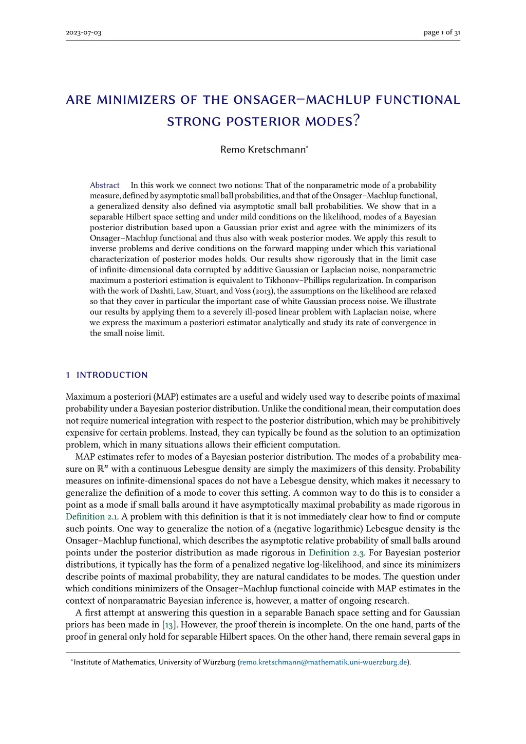 In this work we connect two notions: That of the nonparametric mode of a probability measure, defined by asymptotic small ball probabilities, and that of the Onsager-Machlup functional, a generalized density also defined via asymptotic small ball probabilities. We show that in a separable Hilbert space setting and under mild conditions on the likelihood, modes of a Bayesian posterior distribution based upon a Gaussian prior exist and agree with the minimizers of its Onsager-Machlup functional and thus also with weak posterior modes. We apply this result to inverse problems and derive conditions on the forward mapping under which this variational characterization of posterior modes holds. Our results show rigorously that in the limit case of infinite-dimensional data corrupted by additive Gaussian or Laplacian noise, nonparametric maximum a posteriori estimation is equivalent to Tikhonov-Phillips regularization. In comparison with the work of Dashti, Law, Stuart, and Voss (2013), the assumptions on the likelihood are relaxed so that they cover in particular the important case of white Gaussian process noise. We illustrate our results by applying them to a severely ill-posed linear problem with Laplacian noise, where we express the maximum a posteriori estimator analytically and study its rate of convergence in the small noise limit.