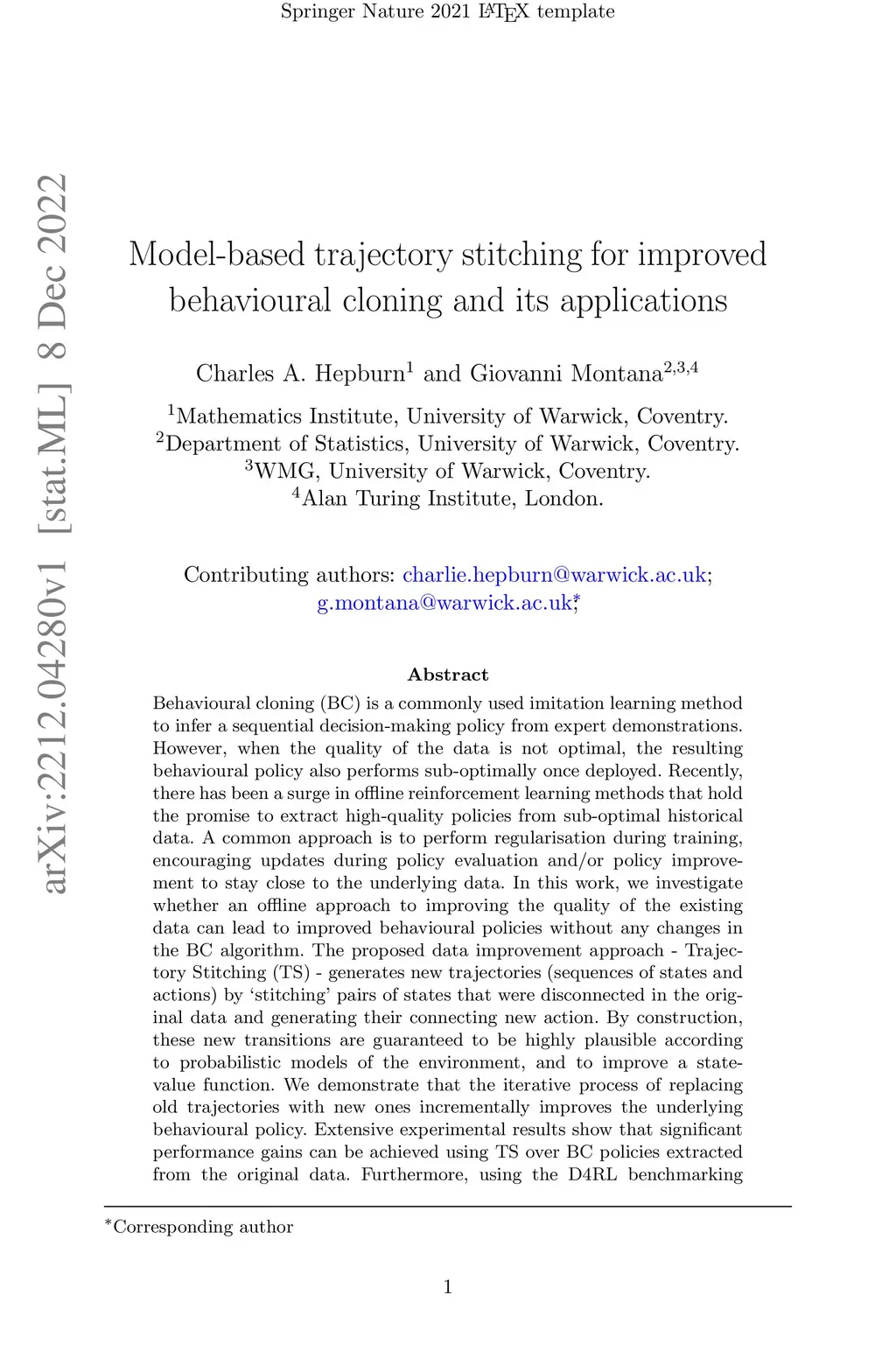 Model-based trajectory stitching for improved behavioural cloning and