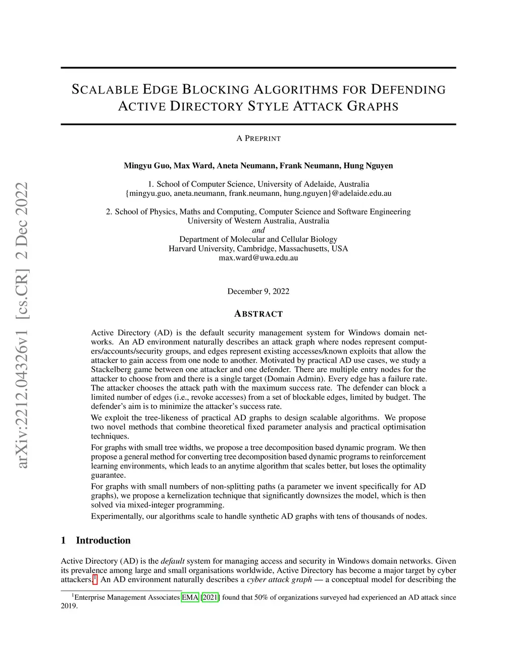 Active Directory (AD) is the default security management system for Windows domain networks. An AD environment naturally describes an attack graph where nodes represent computers/accounts/security groups, and edges represent existing accesses/known exploits that allow the attacker to gain access from one node to another. Motivated by practical AD use cases, we study a Stackelberg game between one attacker and one defender. There are multiple entry nodes for the attacker to choose from and there is a single target (Domain Admin). Every edge has a failure rate. The attacker chooses the attack path with the maximum success rate. The defender can block a limited number of edges (i.e., revoke accesses) from a set of blockable edges, limited by budget. The defender's aim is to minimize the attacker's success rate. We exploit the tree-likeness of practical AD graphs to design scalable algorithms. We propose two novel methods that combine theoretical fixed parameter analysis and practical optimisation techniques. For graphs with small tree widths, we propose a tree decomposition based dynamic program. We then propose a general method for converting tree decomposition based dynamic programs to reinforcement learning environments, which leads to an anytime algorithm that scales better, but loses the optimality guarantee. For graphs with small numbers of non-splitting paths (a parameter we invent specifically for AD graphs), we propose a kernelization technique that significantly downsizes the model, which is then solved via mixed-integer programming. Experimentally, our algorithms scale to handle synthetic AD graphs with tens of thousands of nodes.