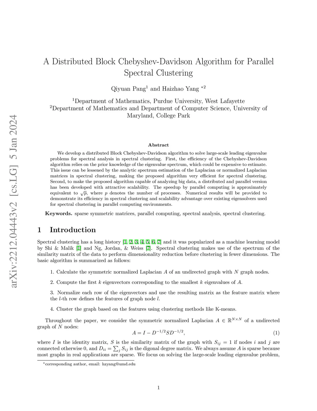 We develop a distributed Block Chebyshev-Davidson algorithm to solve large-scale leading eigenvalue problems for spectral analysis in spectral clustering. First, the efficiency of the Chebyshev-Davidson algorithm relies on the prior knowledge of the eigenvalue spectrum, which could be expensive to estimate. This issue can be lessened by the analytic spectrum estimation of the Laplacian or normalized Laplacian matrices in spectral clustering, making the proposed algorithm very efficient for spectral clustering. Second, to make the proposed algorithm capable of analyzing big data, a distributed and parallel version has been developed with attractive scalability. The speedup by parallel computing is approximately equivalent to , where denotes the number of processes. {Numerical results will be provided to demonstrate its efficiency in spectral clustering and scalability advantage over existing eigensolvers used for spectral clustering in parallel computing environments.}
