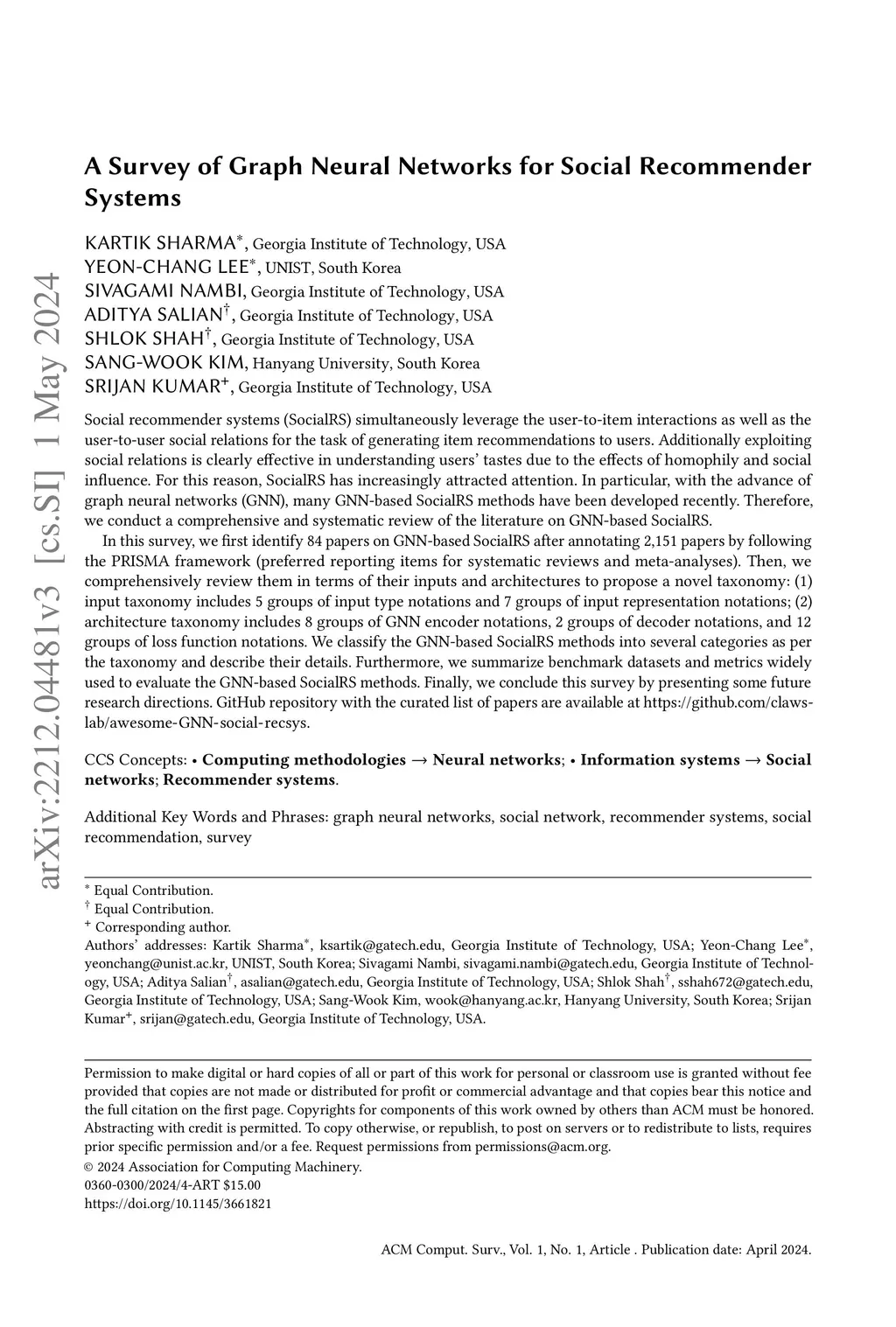 Social recommender systems (SocialRS) simultaneously leverage the user-to-item interactions as well as the user-to-user social relations for the task of generating item recommendations to users. Additionally exploiting social relations is clearly effective in understanding users' tastes due to the effects of homophily and social influence. For this reason, SocialRS has increasingly attracted attention. In particular, with the advance of graph neural networks (GNN), many GNN-based SocialRS methods have been developed recently. Therefore, we conduct a comprehensive and systematic review of the literature on GNN-based SocialRS. In this survey, we first identify 84 papers on GNN-based SocialRS after annotating 2151 papers by following the PRISMA framework (preferred reporting items for systematic reviews and meta-analyses). Then, we comprehensively review them in terms of their inputs and architectures to propose a novel taxonomy: (1) input taxonomy includes 5 groups of input type notations and 7 groups of input representation notations; (2) architecture taxonomy includes 8 groups of GNN encoder notations, 2 groups of decoder notations, and 12 groups of loss function notations. We classify the GNN-based SocialRS methods into several categories as per the taxonomy and describe their details. Furthermore, we summarize benchmark datasets and metrics widely used to evaluate the GNN-based SocialRS methods. Finally, we conclude this survey by presenting some future research directions. GitHub repository with the curated list of papers are available at https://github.com/claws-lab/awesome-GNN-social-recsys.