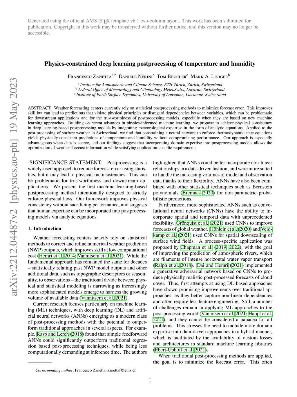Weather forecasting centers currently rely on statistical postprocessing methods to minimize forecast error. This improves skill but can lead to predictions that violate physical principles or disregard dependencies between variables, which can be problematic for downstream applications and for the trustworthiness of postprocessing models, especially when they are based on new machine learning approaches. Building on recent advances in physics-informed machine learning, we propose to achieve physical consistency in deep learning-based postprocessing models by integrating meteorological expertise in the form of analytic equations. Applied to the post-processing of surface weather in Switzerland, we find that constraining a neural network to enforce thermodynamic state equations yields physically-consistent predictions of temperature and humidity without compromising performance. Our approach is especially advantageous when data is scarce, and our findings suggest that incorporating domain expertise into postprocessing models allows to optimize weather forecast information while satisfying application-specific requirements.