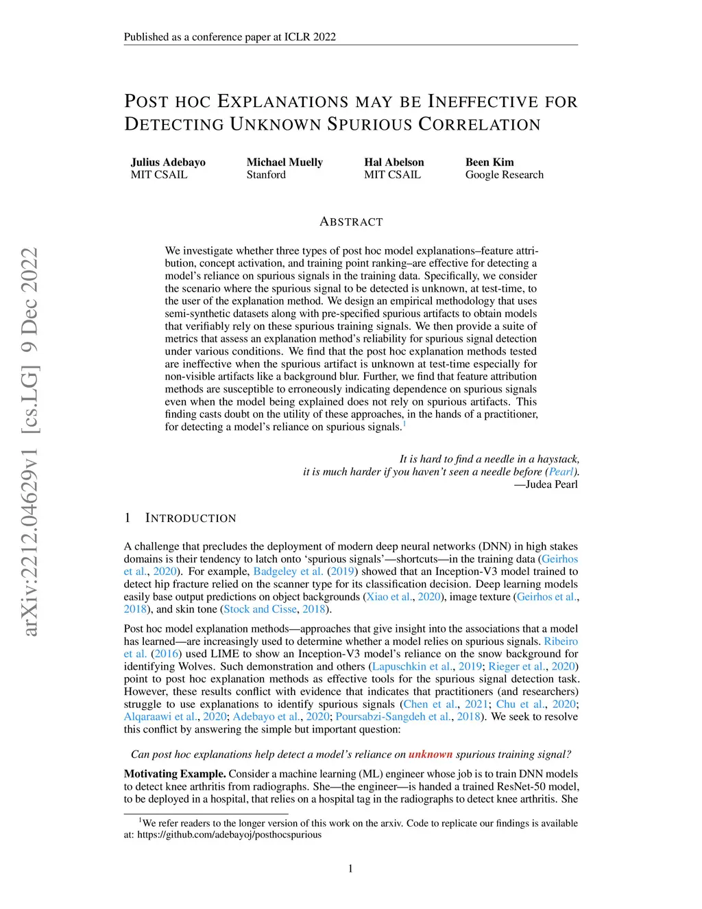 Post hoc Explanations may be Ineffective for Detecting Unknown Spurious