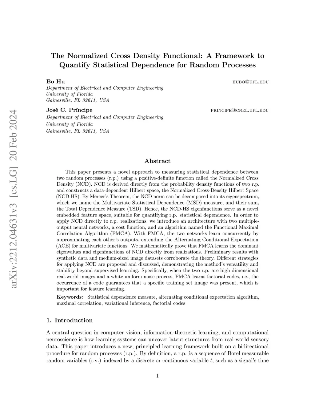 This paper presents a novel approach to measuring statistical dependence between two random processes (r.p.) using a positive-definite function called the Normalized Cross Density (NCD). NCD is derived directly from the probability density functions of two r.p. and constructs a data-dependent Hilbert space, the Normalized Cross-Density Hilbert Space (NCD-HS). By Mercer's Theorem, the NCD norm can be decomposed into its eigenspectrum, which we name the Multivariate Statistical Dependence (MSD) measure, and their sum, the Total Dependence Measure (TSD). Hence, the NCD-HS eigenfunctions serve as a novel embedded feature space, suitable for quantifying r.p. statistical dependence. In order to apply NCD directly to r.p. realizations, we introduce an architecture with two multiple-output neural networks, a cost function, and an algorithm named the Functional Maximal Correlation Algorithm (FMCA). With FMCA, the two networks learn concurrently by approximating each other's outputs, extending the Alternating Conditional Expectation (ACE) for multivariate functions. We mathematically prove that FMCA learns the dominant eigenvalues and eigenfunctions of NCD directly from realizations. Preliminary results with synthetic data and medium-sized image datasets corroborate the theory. Different strategies for applying NCD are proposed and discussed, demonstrating the method's versatility and stability beyond supervised learning. Specifically, when the two r.p. are high-dimensional real-world images and a white uniform noise process, FMCA learns factorial codes, i.e., the occurrence of a code guarantees that a specific training set image was present, which is important for feature learning.