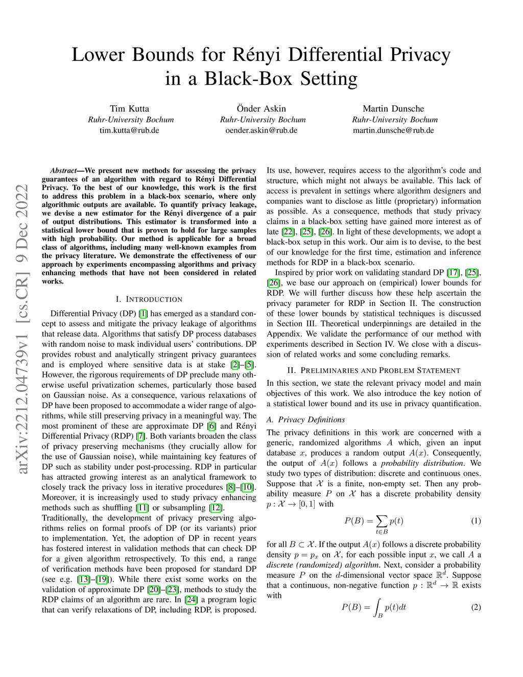 We present new methods for assessing the privacy guarantees of an algorithm with regard to R\ényi Differential Privacy. To the best of our knowledge, this work is the first to address this problem in a black-box scenario, where only algorithmic outputs are available. To quantify privacy leakage, we devise a new estimator for the R\ényi divergence of a pair of output distributions. This estimator is transformed into a statistical lower bound that is proven to hold for large samples with high probability. Our method is applicable for a broad class of algorithms, including many well-known examples from the privacy literature. We demonstrate the effectiveness of our approach by experiments encompassing algorithms and privacy enhancing methods that have not been considered in related works.